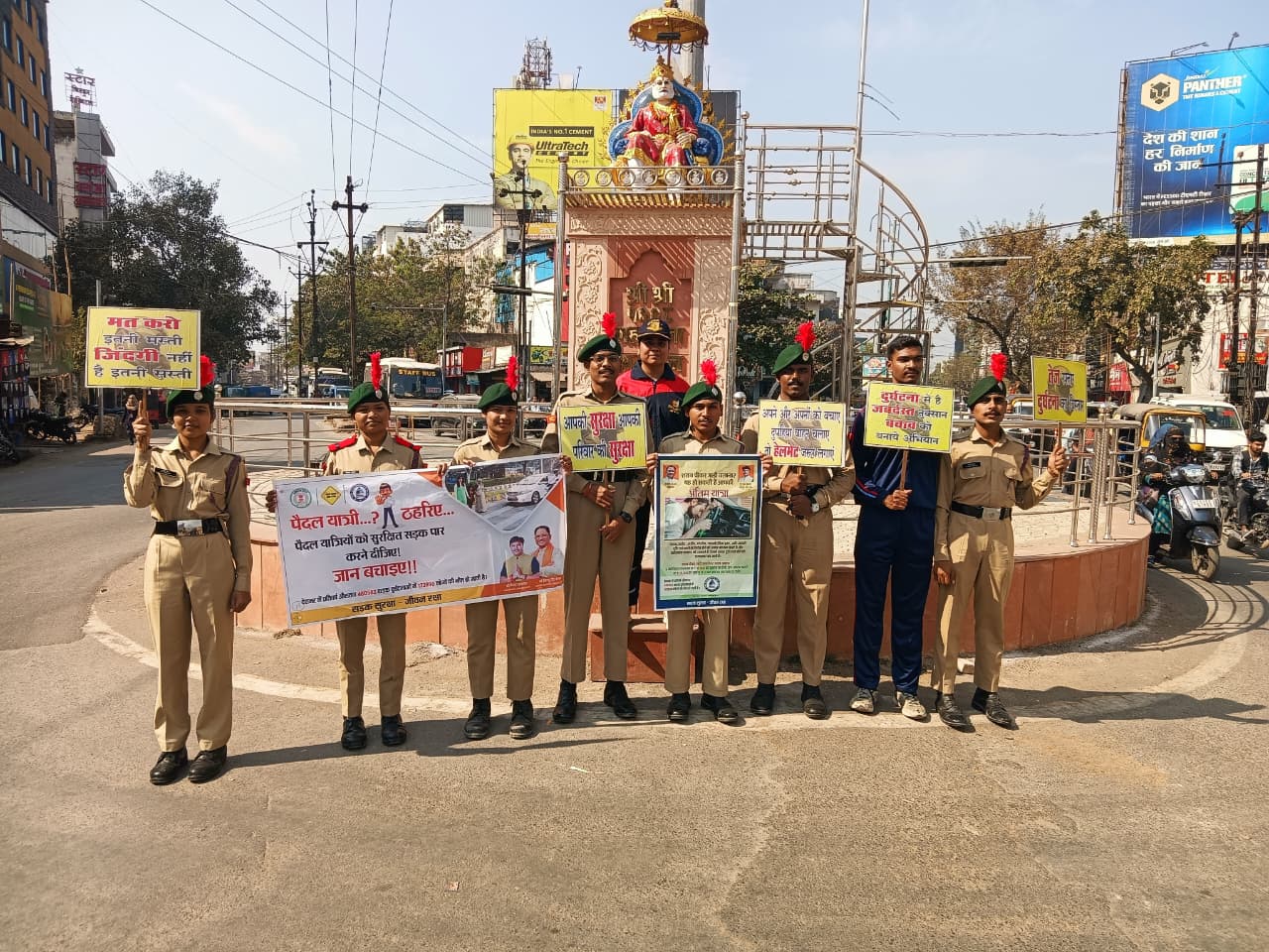 NCC एवं NSS के छात्र-छात्राओं ने किया प्रमुख चौराहों पर यातायात जागरूकता गतिविधि।
