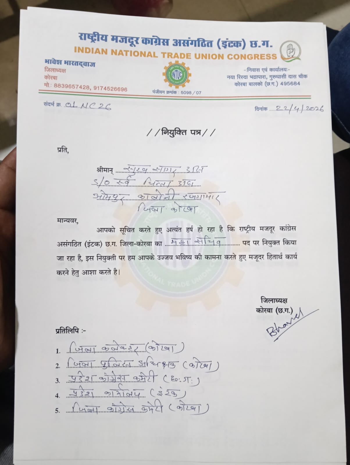 कोरबा (न्यूज उड़ान ) कल दिनांक 22/4/26 को राष्ट्रीय मजदूर कांग्रेस असंगठित(इंटक ) के प्रदेश उपाध्यक्ष संतोष एवं कोरबा जिलाध्यक्ष भावेश भारद्वाज सीतामढ़ी कोरबा गेस्ट हाउस मे रजगामार के वरिष्ठ कांग्रेस नेता सुखसागर दास को राष्ट्रीय मजदूर कांग्रेस कोरबा का जिला महासचिव नियक्ति किया गया ।
