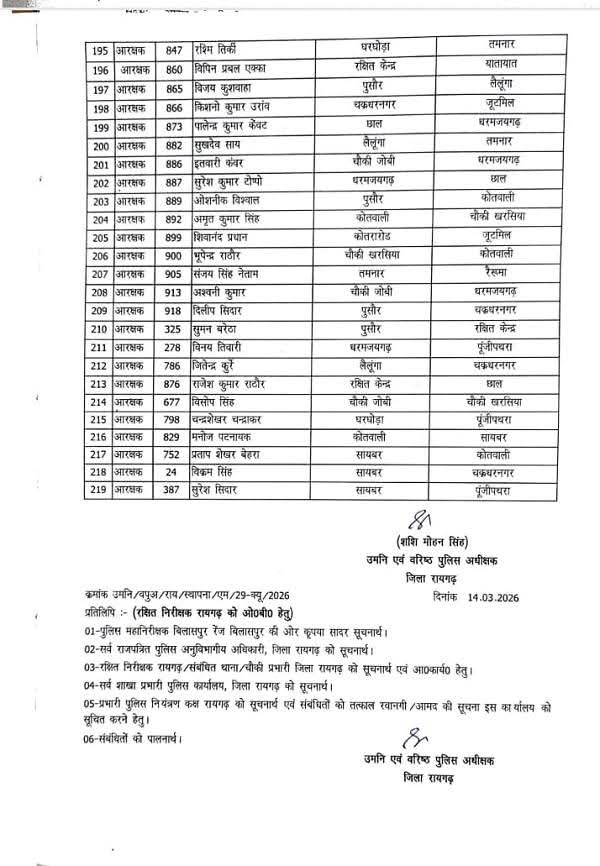 रायगढ़ पुलिस महकमे में बड़ा फेरबदल; SSP ने जारी किया आदेश, 219 पुलिसकर्मियों के प्रभार बदले..