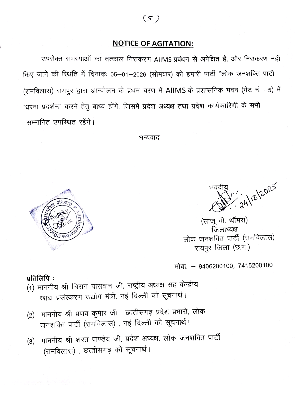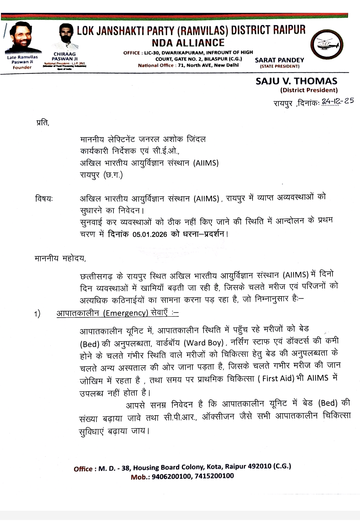 रायपुर( न्यूज उड़ान ) जिला कार्यकारिणी बैठक दिनांक: 21-12-2025 में लिए गए निर्णय अनुसार लोक जनशक्ति पार्टी (रामविलास) के रायपुर जिलाध्यक्ष साजू वी थॉमस द्वारा आज नोटिस सौंपकर तत्काल AIIMS में व्याप्त अव्यवस्था / असुविधाओं के निराकरण नहीं करने पर आंदोलन करने की चेतावनी देते हुए दिनांक:5 जनवरी 2026 को प्रथम चरण में धरना-प्रदर्शन करने का आह्वान किया है |