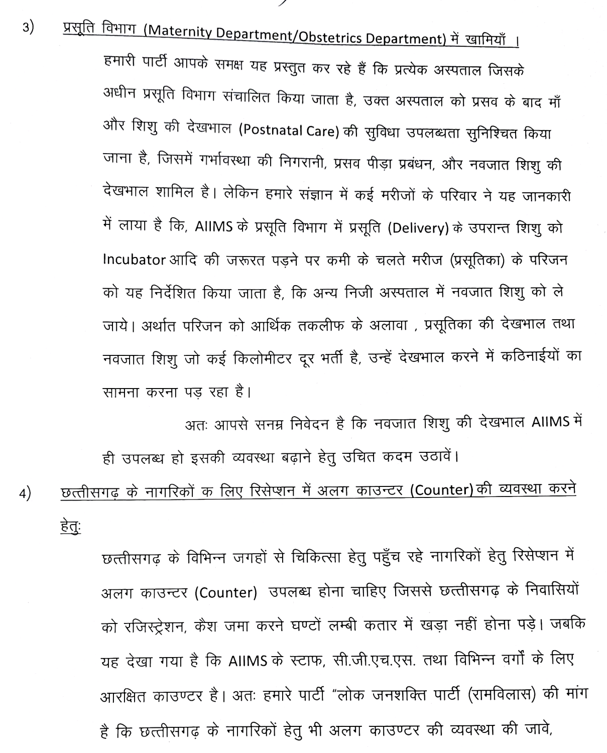 - साजू वी थॉमस, जिलाध्यक्ष, लोक जनशक्ति पार्टी(रामविलास),रायपुर जिला ने AIIMS प्रबंधन को आज सौंपा नोटिस ।