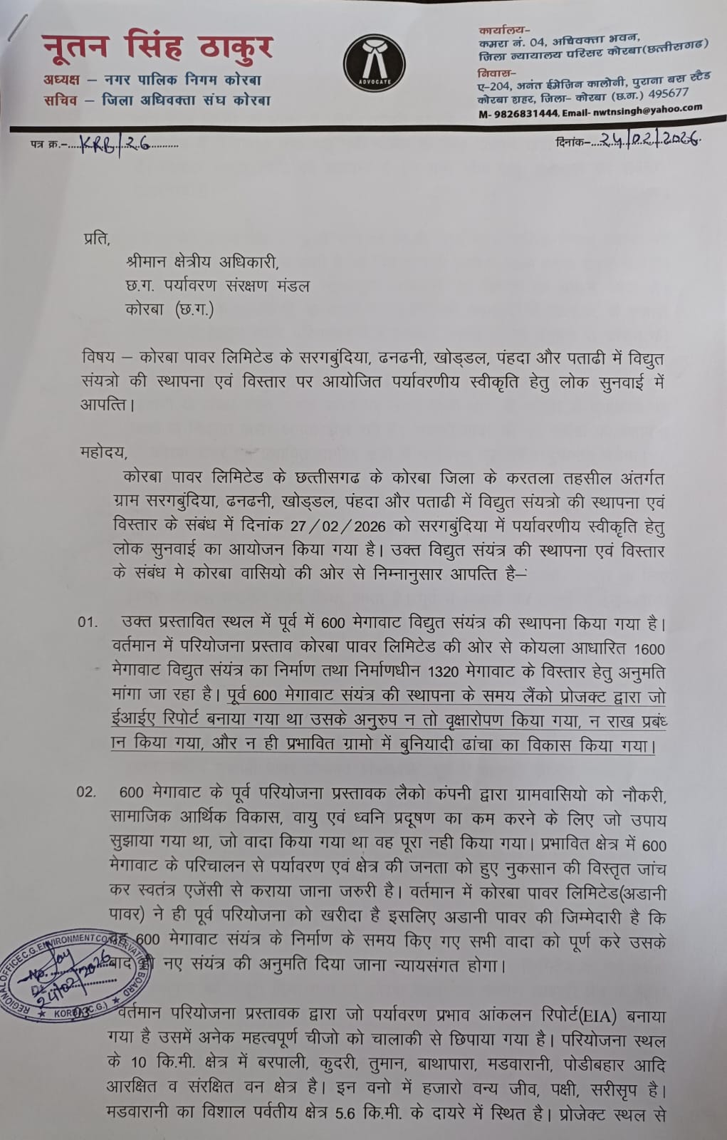 पर्यावरणीय स्वीकृति प्राप्त करने के लिए कोरबा के संरक्षित वनक्षेत्र, पर्वतों, जनसंख्या के आंकड़ो, निगम क्षेत्र, जलीय संतुलन, जीव जंतु पक्षियो की जानकारी तथा पूर्व प्रदूषण स्तर के संवेदनशील जानकारी को गलत तरीके से पेश किया गया है जिसके कारण 27 फरवरी को आयोजित जनसुनवाई को निरस्त करने तथा वैधानिक जांच करने की मांग पर्यावरण संरक्षण मंडल तथा जिलाधीश कोरबा से किया गया है।