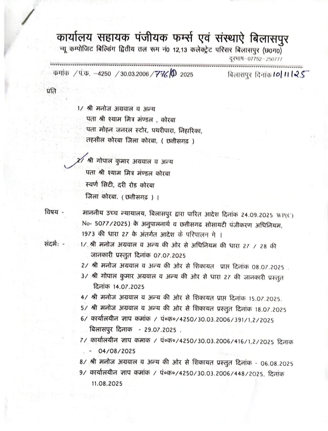 वहीं दूसरी ओर, पूर्व अमान्य कार्यकारिणी द्वारा तथ्यों को भ्रामक रूप से प्रस्तुत करते हुए दिनांक 01 जुलाई 2025 को स्वयंभू कार्यकारिणी का गठन किया गया और दिनांक 07 जुलाई 2025 को माननीय सहायक पंजीयक, फर्म्स एंड सोसायटीज़, बिलासपुर ज्ञान प्रकाश साहू) के समक्ष धारा 27 के अंतर्गत विवरण प्रस्तुत कर दिया गया।