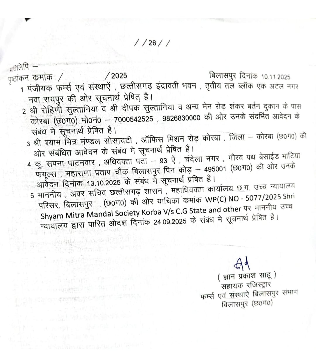 कोरबा( न्यूज उड़ान )श्री श्याम मित्र मंडल, कोरबा के चुनाव से जुड़े विवाद पर सहायक पंजीयक, फर्म्स एंड सोसायटीज़, बिलासपुर ज्ञान प्रकाश साहू) द्वारा दिनांक 10 नवंबर 2025 को एक महत्वपूर्ण आदेश पारित किया गया है।