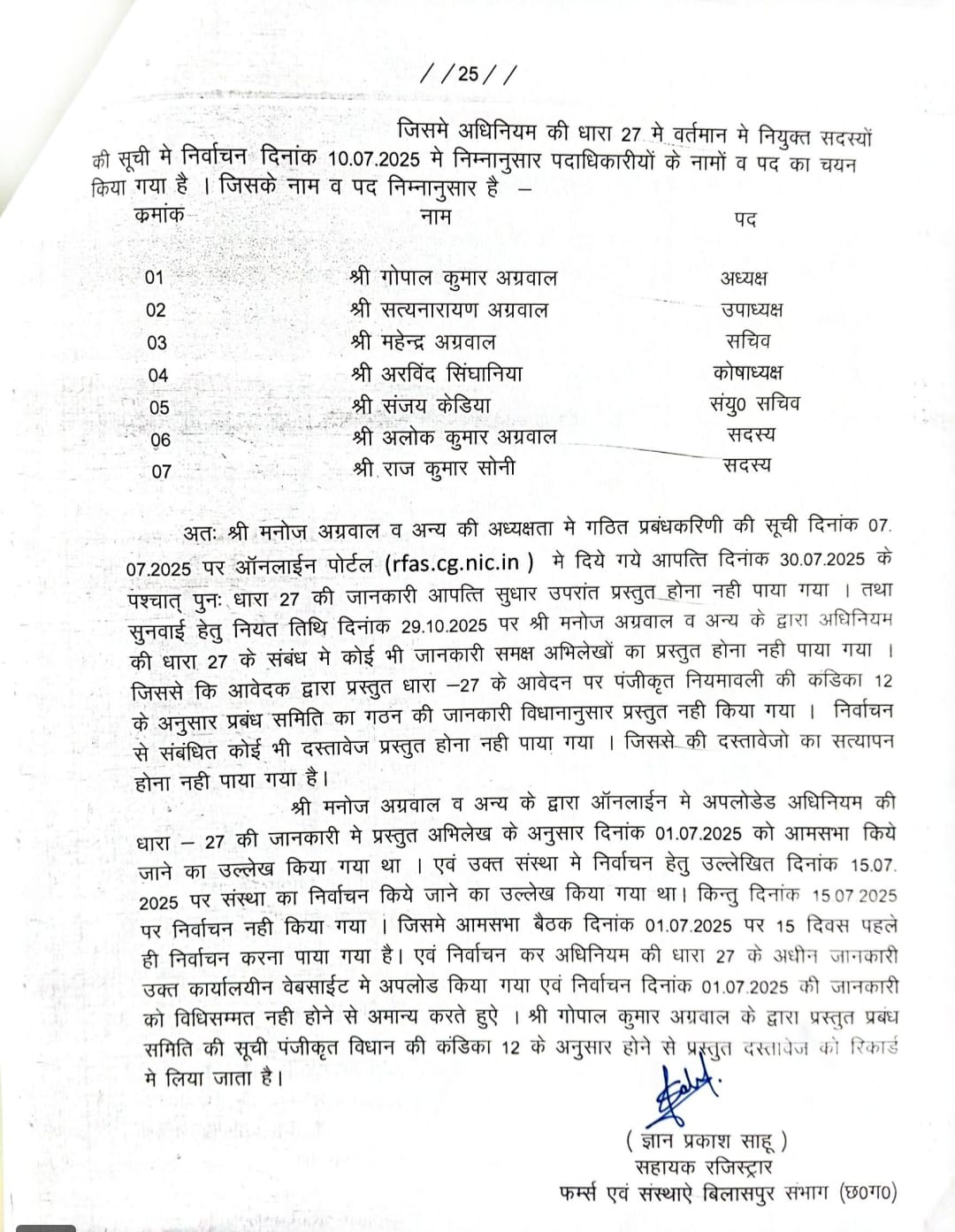 आदेश में कहा गया है कि संस्था कि तरफ से गोपाल अग्रवाल द्वारा दिनांक 14/07/2025 को प्रस्तुत धारा 27 (छत्तीसगढ़ सोसायटी पंजीयन अधिनियम) के अंतर्गत प्रस्तुत निर्वाचन सूचना, अभिलेख, मतगणना विवरण तथा ऑनलाइन प्रस्तुत समिति सूची नियम अनुसार पाई गई।