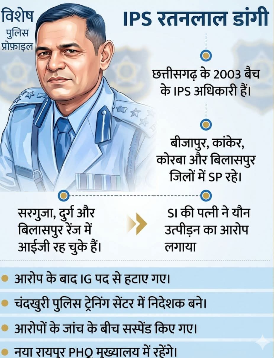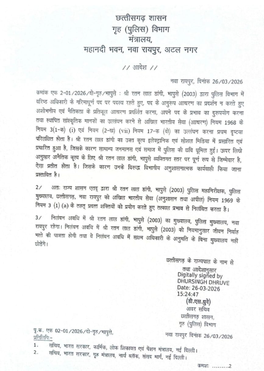 रायपुर( न्यूज उड़ान ) छत्तीसगढ़ शासन के गृह (पुलिस) विभाग ने वरिष्ठ आईपीएस अधिकारी रतनलाल डांगी को तत्काल प्रभाव से निलंबित कर दिया है।
