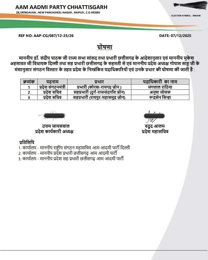 कोरबा( न्यूज उड़ान )आम आदमी पार्टी छत्तीसगढ़ प्रदेश प्रभारी डॉ संदीप पाठक, सह प्रभारी मुकेश अहलावत के सहमति से प्रदेश अध्यक्ष गोपाल साहू के मशा अनुसार संगठन विस्तार के तहत, प्रदेश कार्यकारी अध्यक्ष उत्तम जायसवाल और प्रदेश महासचिव वदूद आलम की अनुशंसा पर पूर्व जिला अध्यक्ष कोरबा ( ग्रामीण )जग़लाल राठिया को प्रदेश संगठन मंत्री व कोरबा रायगढ़ जॉन प्रभारी नियुक्त किया गया है ।