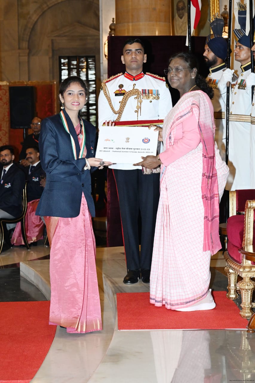 कोरबा (न्यूज उड़ान )शासकीय ई. वी. पी. जी. कॉलेज, कोरबा की पूर्व छात्रा एवं सक्रिय एनएसएस स्वयंसेविका सुश्री लखनी साहू को महामहिम राष्ट्रपति श्रीमती द्रौपदी मुर्मू के कर-कमलों द्वारा “एमवाई भारत - राष्ट्रीय सेवा योजना (एनएसएस) पुरस्कार” से सम्मानित किया गया।