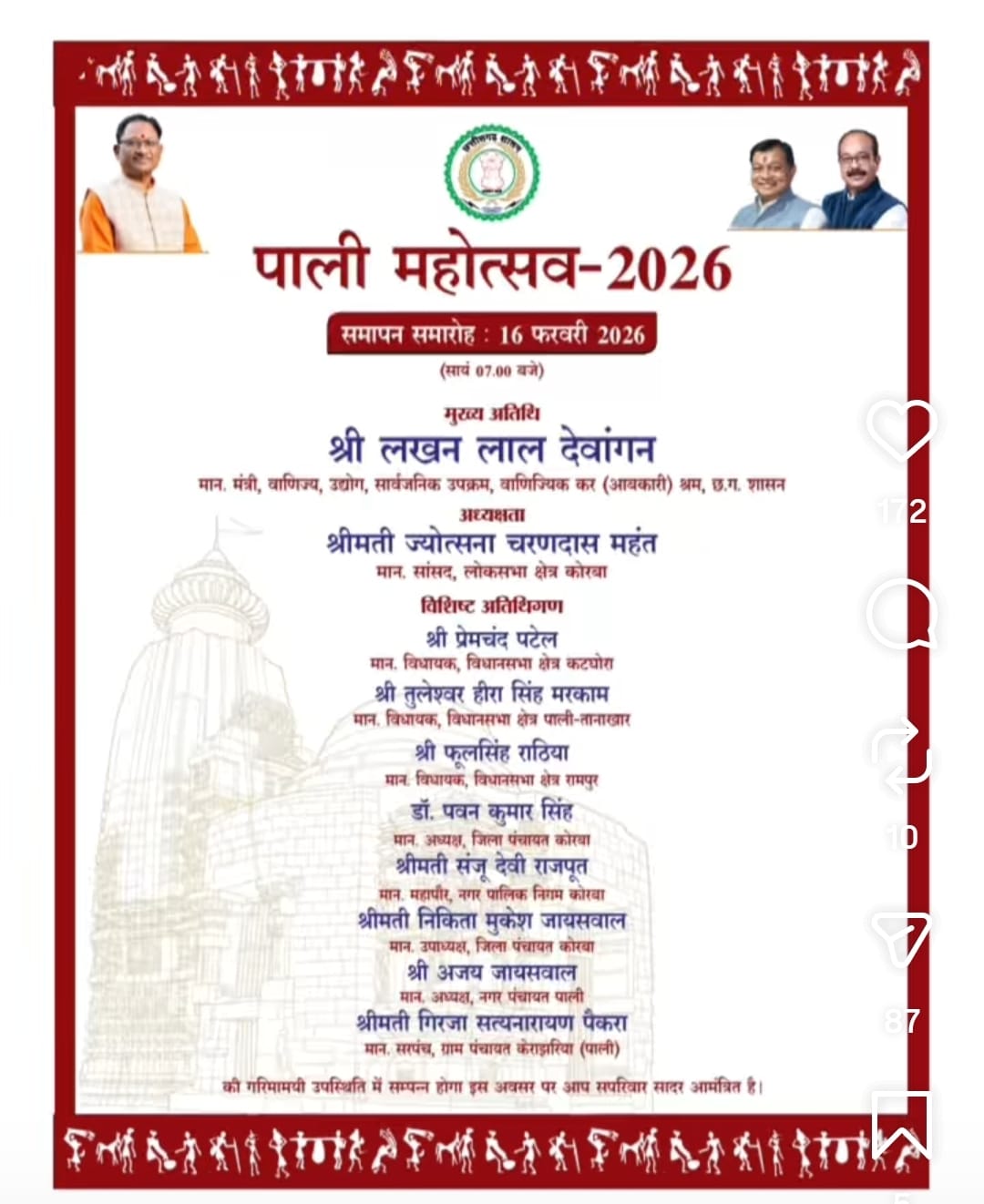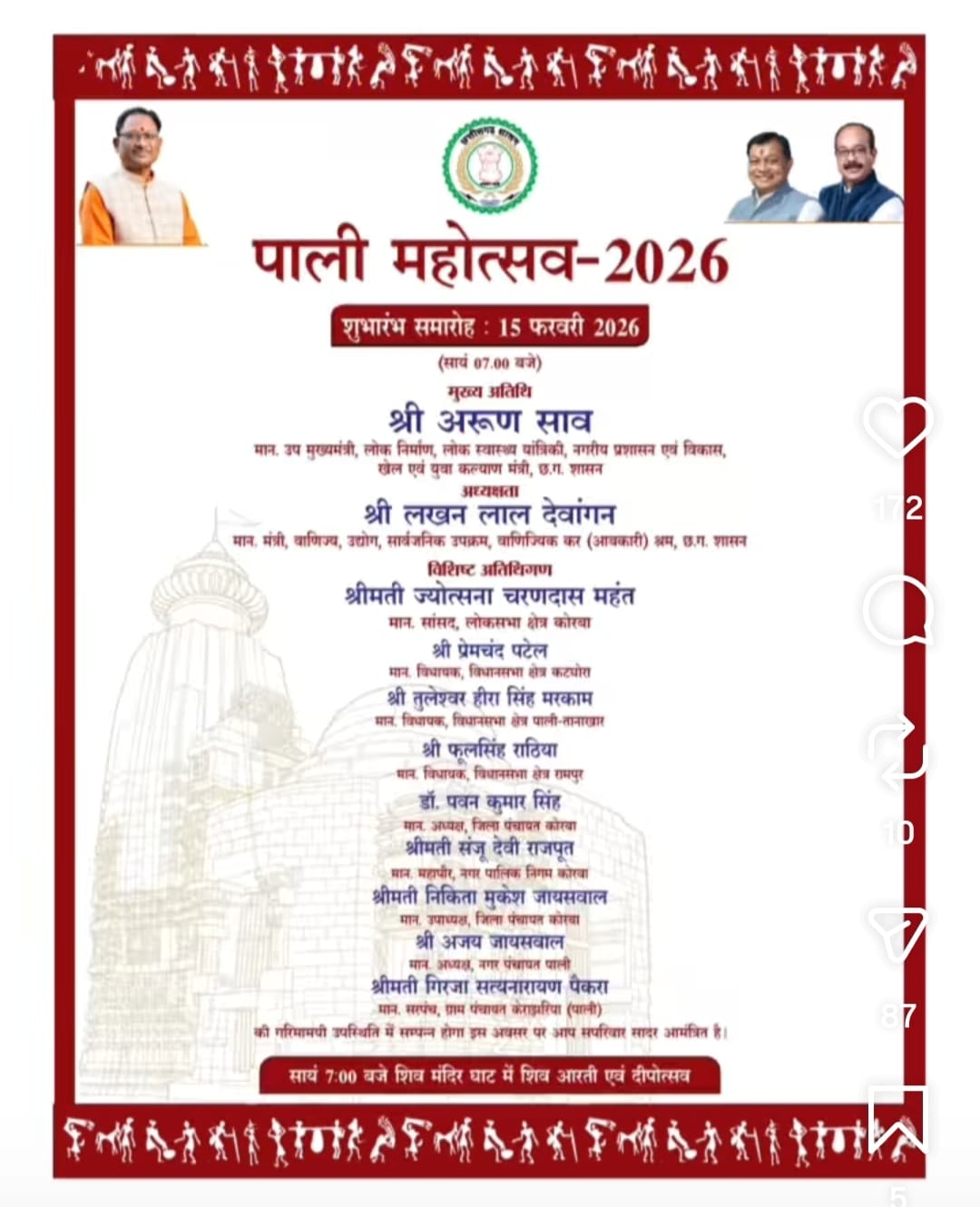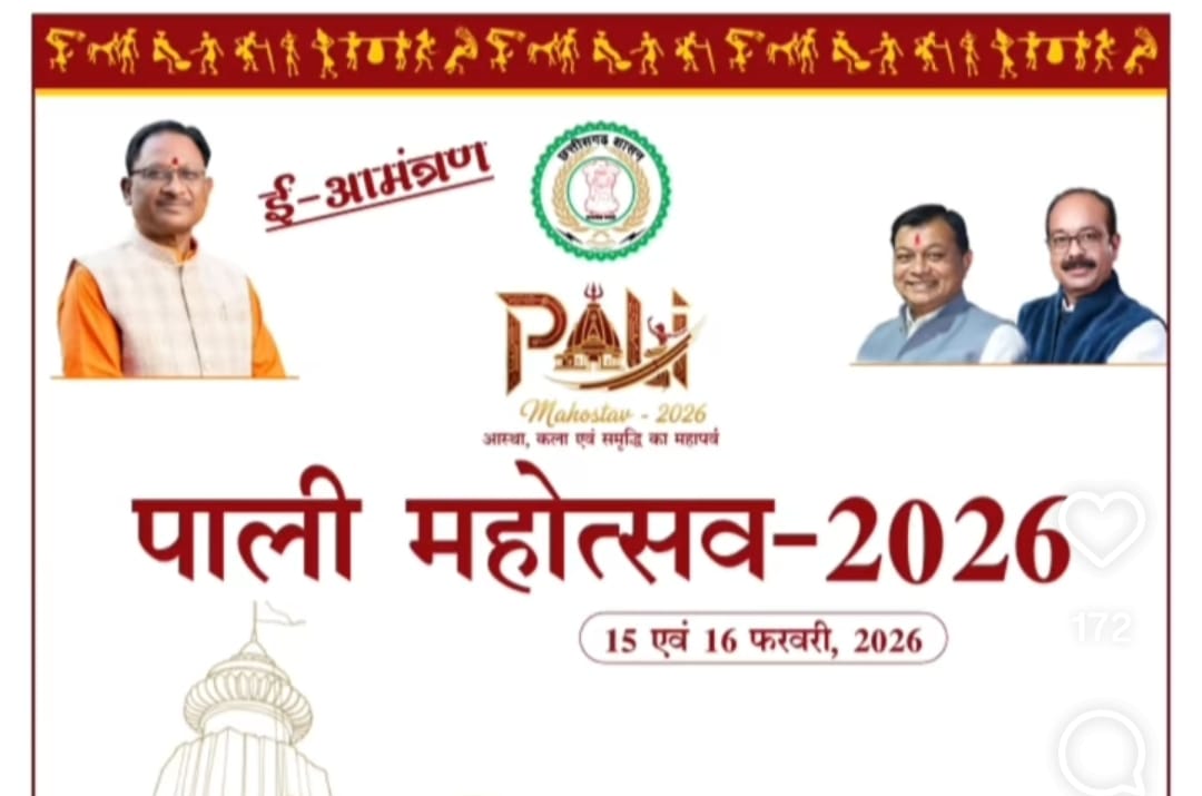 कोरबा : पाली महोत्सव 2026 का शुभारंभ। उपमुख्यमंत्री मंत्री श्री अरुण साव मुख्य अतिथि के रूप में होंगे शामिल।