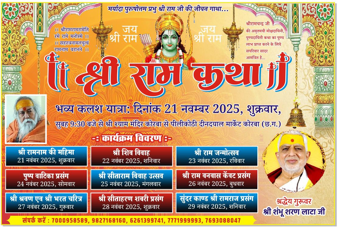 कोरबा : कोरबा में श्री राम कथा का आरंभ 21 नवंबर से, पीलीकोठी परिसर में होगा भव्य आयोजन।