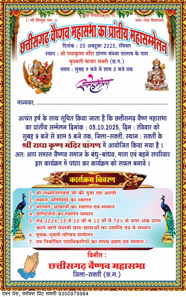 कोरबा : छत्तीसगढ़ वैष्णव समाज महासभा का प्रान्तीय सम्मेलन 5 अक्टूबर सक्ति के मंदिर प्रांगण।