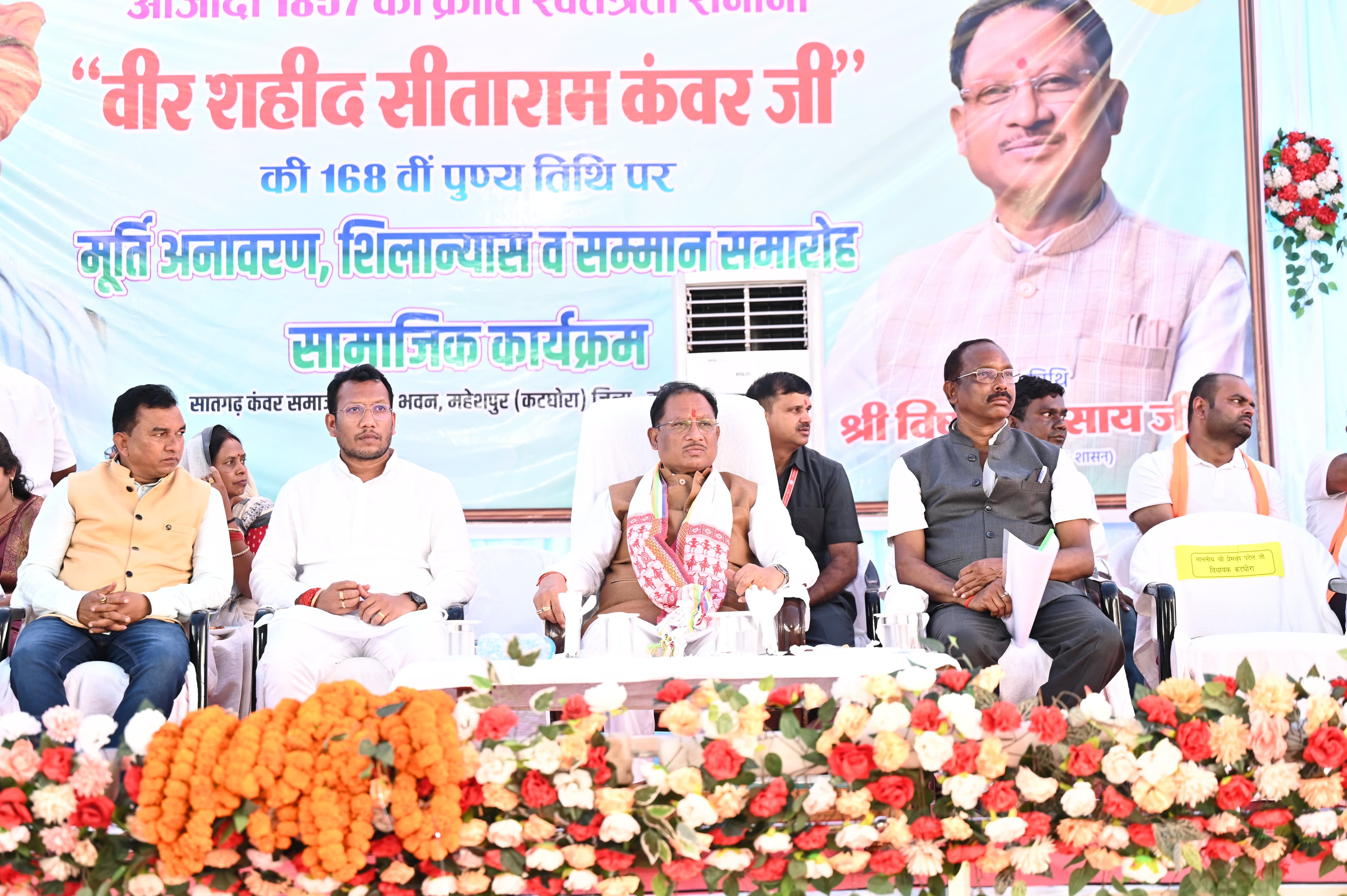 मुख्यमंत्री विष्णुदेव साय आज कटघोरा में सातगढ़ कँवर समाज के सामाजिक सम्मेलन-1857 के स्वतंत्रता संग्राम सेनानी वीर शहीद सीताराम कँवर के पुण्य तिथि समारोह सहित रामपुर चौक में शहीद सीताराम कँवर के प्रतिमा अनावरण तथा ग्राम कसनिया मोड़ में भगवान सहस्त्रबाहु के नाम पर चौक का नामकरण, मूर्ति स्थापना और प्रवेश द्वार सह उद्यान निर्माण के भूमिपूजन कार्यक्रम में शामिल हुए।