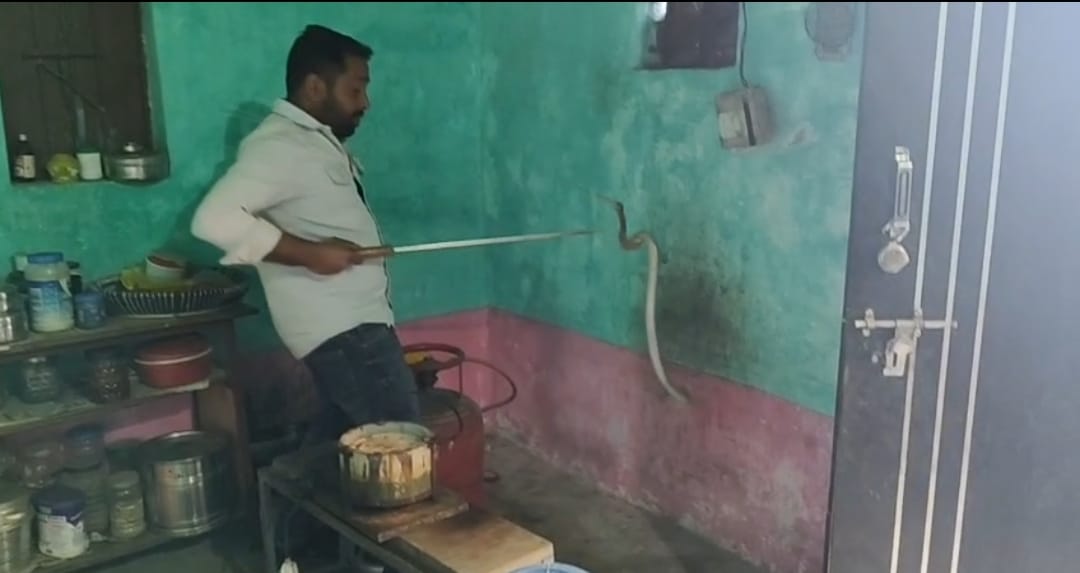 कोरबा : किचन में गैस सिलेंडर के पिछे फन फैलाए बैठा था नाग, नोवा नेचर की टीम ने किया सुरक्षित रेस्क्यू।