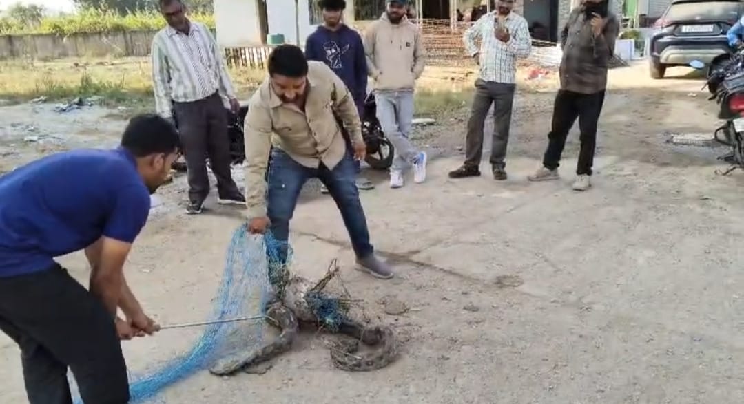 कोरबा : खेत में लगे जाल में पूरी तरह फसा था विशाल काय अजगर, रेस्क्यु के समय खतरनाक हमला करते दिखा अजगर ।