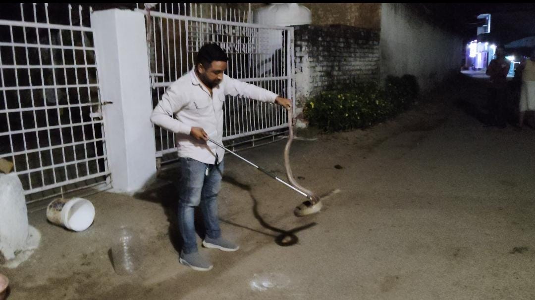 कोरबा : बाल्टी में घुस कर बैठ गया विशालकाय नाग,जितेन्द्र सारथी ने किया सफल रेस्क्यू।
