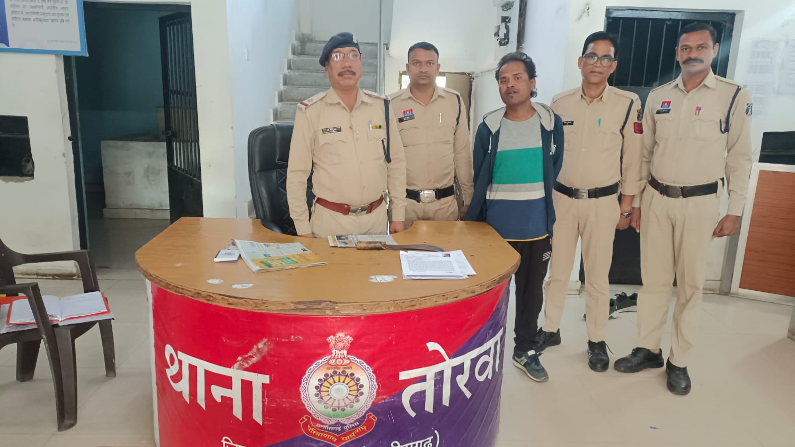 दिनांक 08.02.2025 को थाना तोरवा को सूचना प्राप्त हुई हेमुनगर मुर्राभट्टा गली में नवीन कांति उर्फ पापा नामक व्यक्ति लोहे का खुखरी (चाकू) लेकर आमजनों को डरा धमका रहा है कि सूचना मिलने पर अतिरिक्त पुलिस अधीक्षक शहर बिलासपुर राजेंद्र जायसवाल एवं सी.एस.पी. (कोतवाली) अक्षय प्रमोद सबद्रा (भापुसे )को अवगत कराया जाकर उनके मार्ग दर्शन एवं प्रभारी निरीक्षक अभय सिंह बैस के नेतृत्व में टीम द्वारा घेराबंदी कर मुर्रा भट्टा गली से आरोपी नवीन कांति उर्फ पापा को पकड़ा गया।