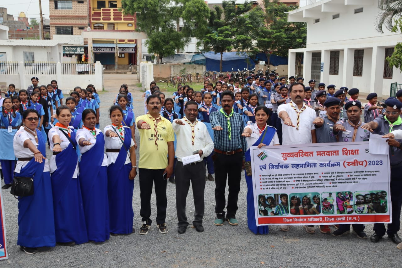 भारत निर्वाचन आयोग के महत्वपूर्ण कार्यक्रम स्वीप को कलेक्टर एवं जिला निर्वाचन अधिकारी श्रीमती नूपुर राशि पन्ना के मार्गदर्शन में भारत स्काउट्स एंड गाइड्स जिला संघ सक्ति के द्वारा आम जनता तक पहुंचाने और समस्त मतदाताओं को जागरूक करने के लिए जिले में मतदाता जागरूकता अभियान की शुरुआत की गई है। जिसके तहत गांव ,शहर ,स्कूलों तथा आमजनता तक स्वीप कार्यक्रम को पहुंचाने व जागरूक करने स्काउट गाइड द्वारा प्रयास किया जा रहा है। 105 स्काउट एंड गाइड्स एवं 15 स्काउट गाइड प्रभारियों की उपस्थिति में जिला स्तरीय मतदाता जागरूकता रैली का आयोजन स्वामी आत्मानंद विद्यालय सक्ती से जे एल एन कालेज ग्राउंड तक किया गया। इस मतदाता जागरूकता रैली को उप जिला निर्वाचन अधिकारी श्री बालेश्वर राम के द्वारा हरी झंडी दिखाकर रवाना किया गया। इस अवसर पर विधायक प्रतिनिधि श्री गिरधर जायसवाल, अपर कलेक्टर श्री बीरेंद्र कुमार लकड़ा ,भारत स्काउट्स एंड गाइड्स जिला मुख्य आयुक्त श्री तनवीर कुरैशी, जिला शिक्षा अधिकारी श्री बी एल खरे, जिला क्रीड़ा अधिकारी श्री अमर सिंह राज बच्चों के उत्साह वर्धन के लिए उपस्थित रहे ।