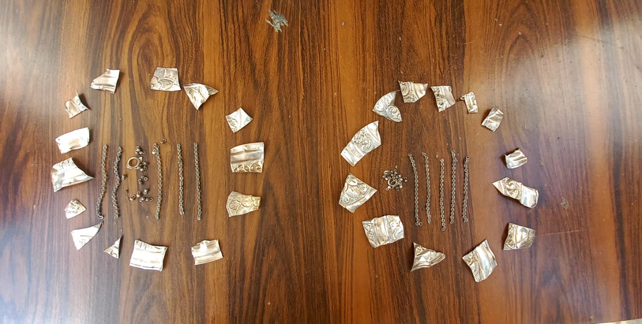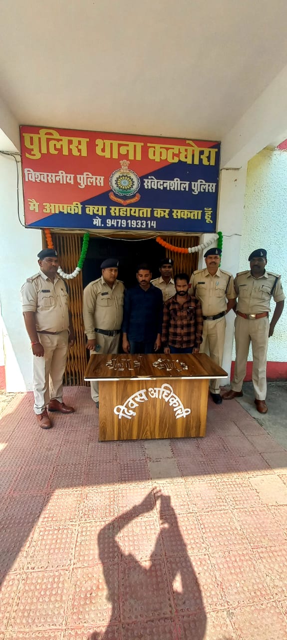 कोरबा। विवरण- थाना कटघोरा के अपराध क्रमांक 391 / 2023 धारा 457, 380, 34 भादवि के प्रार्थी गिरधारी अग्रवाल पिता स्व. रतिराम उम्र 59 साल साकिन कटघोरा दिनांक 05.10.2023 को थाना आकर लिखित आवेदन पेश कर रिपोर्ट दर्ज कराया कि राधासागर तालाब किनारे हनुमान मंदिर का ताला तोड़कर, हनुमान की मूर्ति के उपर लगे लगभग 100 ग्राम चांदी के छत्र को दिनांक 03.10.2023 के रात्रि कोई अज्ञात चोर चोरी कर ले गया है कि रिपोर्ट पर धारा सदर का अपराध कायम कर विवचेना में लिया गया। दौरान विवेचना जरिये मुखबीर सूचना मिलने पर श्रीमान पुलिस अधीक्षक महोदय यू उदय किरण (भापुसे) के निर्देशन, एवं श्रीमान अतिरिक्त पुलिस अधीक्षक महोदय अभिषेक वर्मा तथा श्रीमान अनु० अधि0 महोदय कटघोरा, पंकज ठाकुर के मार्गदर्शन में थाना प्रभारी निरीक्षक तेजकुमार यादव के नेतृत्व में पुलिस टीम गठित कर पतासाजी कर आरोपियो को पकड़ा गया जिनके कब्जे से चोरी गई चांदी की छत्र के टुकडों जप्त कर विधिवित् कार्यवाही कर गिरफ्तार कर माननीय न्यायालय में पेश किया गया।