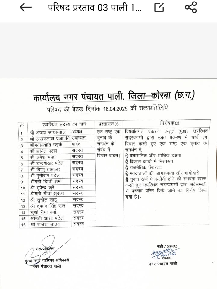 पाली( न्यूज उड़ान )जिला कोरबा, छत्तीसगढ़)। देश में लोकतांत्रिक सुधार की दिशा में एक महत्वपूर्ण पहल के रूप में नगर पंचायत पाली ने 16 अप्रैल 2025 को आयोजित परिषद की बैठक में "एक राष्ट्र, एक चुनाव" के समर्थन में सर्वसम्मति से प्रस्ताव पारित किया। यह बैठक नगर पंचायत अध्यक्ष श्री अजय जायसवाल की अध्यक्षता में संपन्न हुई, जिसमें उपाध्यक्ष श्री तखलाल प्रजापति सहित कुल 16 पार्षदगण उपस्थित रहे।