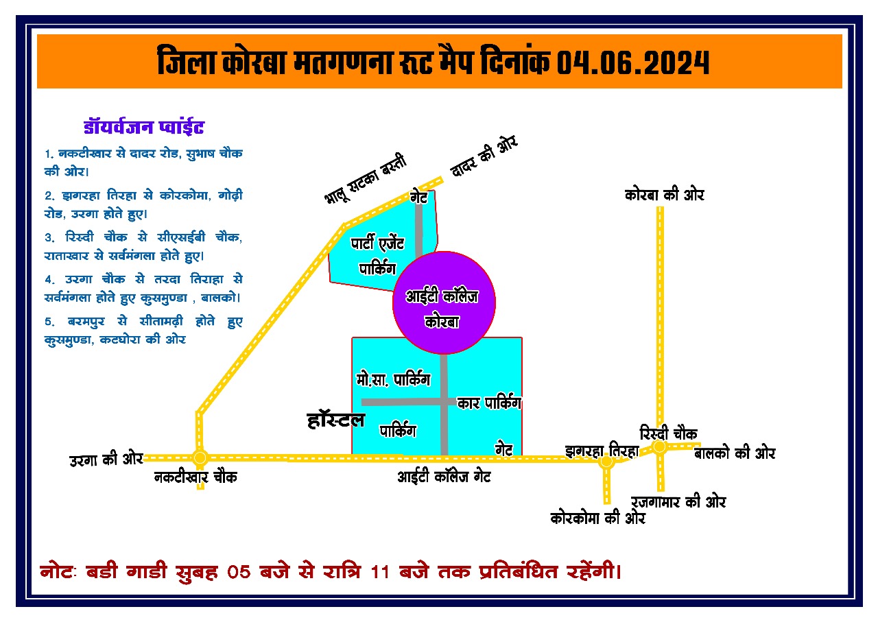 जिला कोरबा (न्यूज उड़ान) में दिनांक 04.06.2024 को लोकसभा निर्वाचन-2024 में मतगणना आई टी कॉलेज झगरहा में किया जाना है।