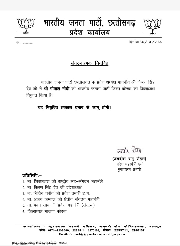 यह नियुक्ति भाजपा कार्यालय, कुशाभाऊ ठाकरे परिसर, रायपुर से विधिवत जारी की गई है।
