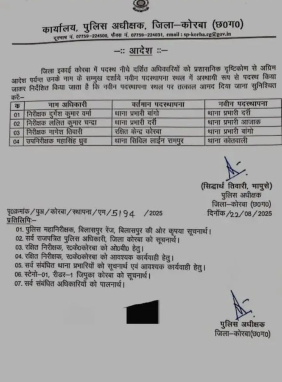 कोरबा। एसपी सिद्दार्थ तिवारी ने तीन थानेदार का तबादला आदेश जारी किया है। प्रमोशन के 24 घंटे के भीतर तिवारी को थाना प्रभारी बनाया गया है। जो महकमे में चर्चा का विषय बना हुआ है।