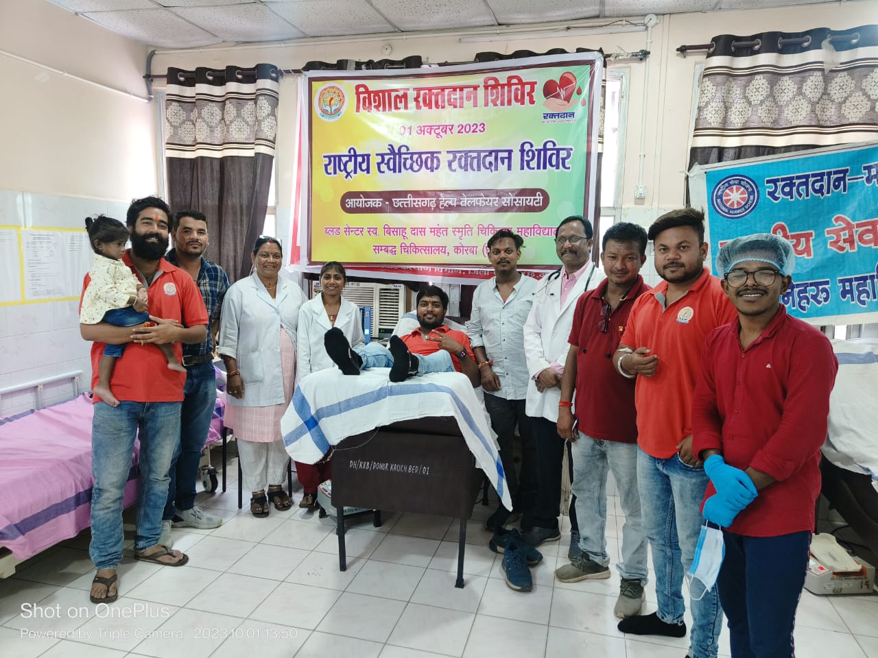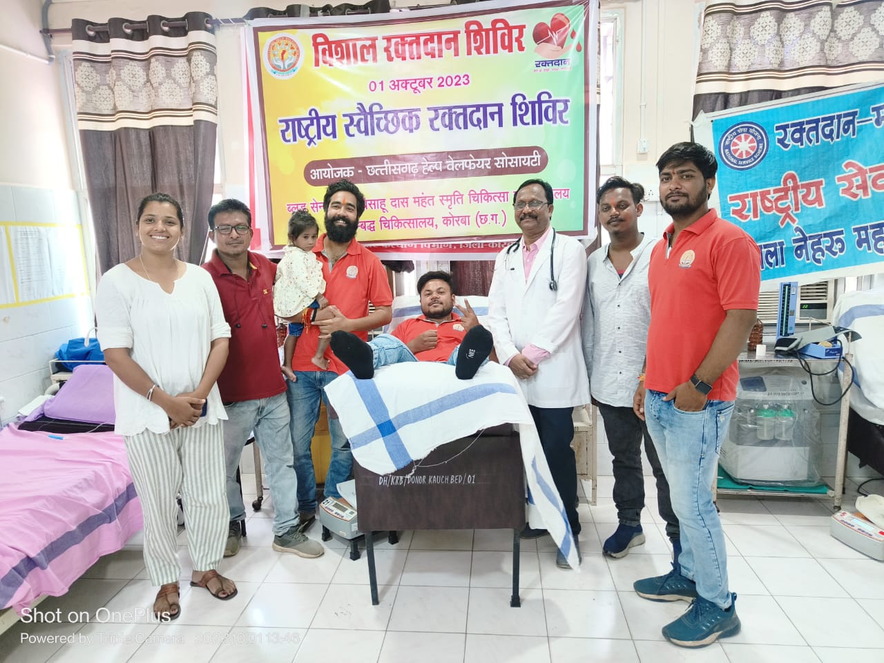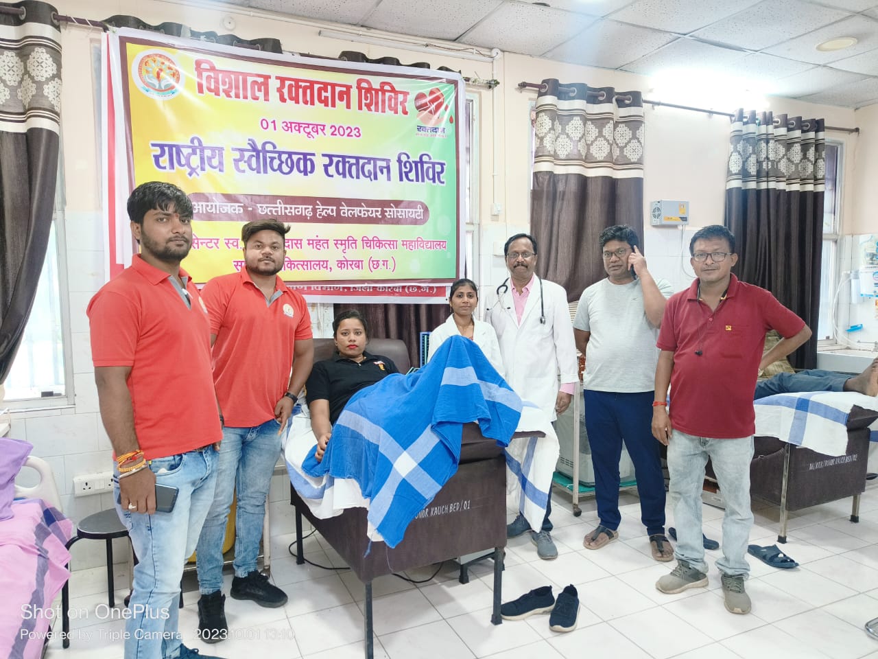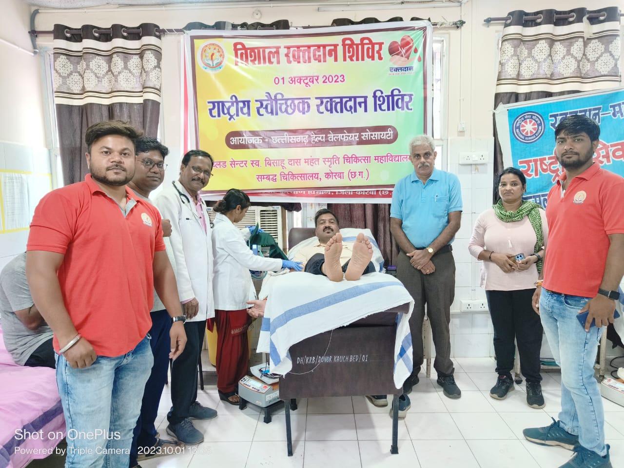 इसी कड़ी में प्रत्येक वर्ष की भांति इस वर्ष भी 01 अक्टूबर को छत्तीसगढ़ हेल्प वेलफेयर सोसाइटी कोरबा शाखा द्वारा राष्ट्रीय स्वैच्छिक रक्तदान दिवस पर मेडिकल कॉलेज कोरबा में हुआ रक्तदान शिविर का आयोजन कराया गया जिसमें कॉलेज व शहर के युवा साथियो ने रक्तदान किया
