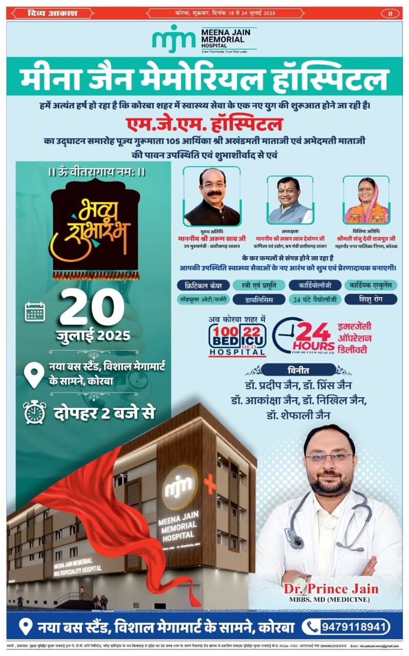 अब यह इंतजार खत्म हो रहा है, क्योंकि मीना जैन मेमोरियल हॉस्पिटल (MJM) का शुभारंभ 20 जुलाई रविवार कोरबा में हो रहा है।