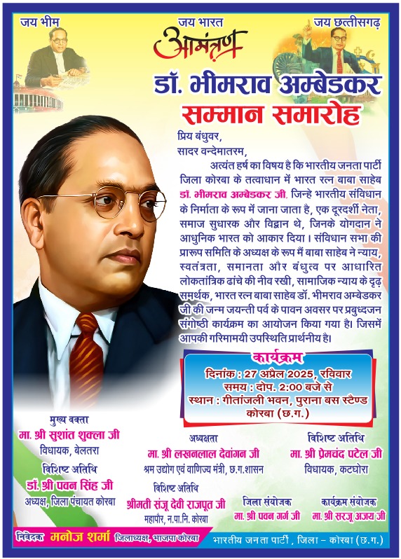 : कोरबा में 27 अप्रैल को होगा डॉ. भीमराव अंबेडकर सम्मान समारोह, भाजपा जिला इकाई करेगी गरिमामय आयोजन।