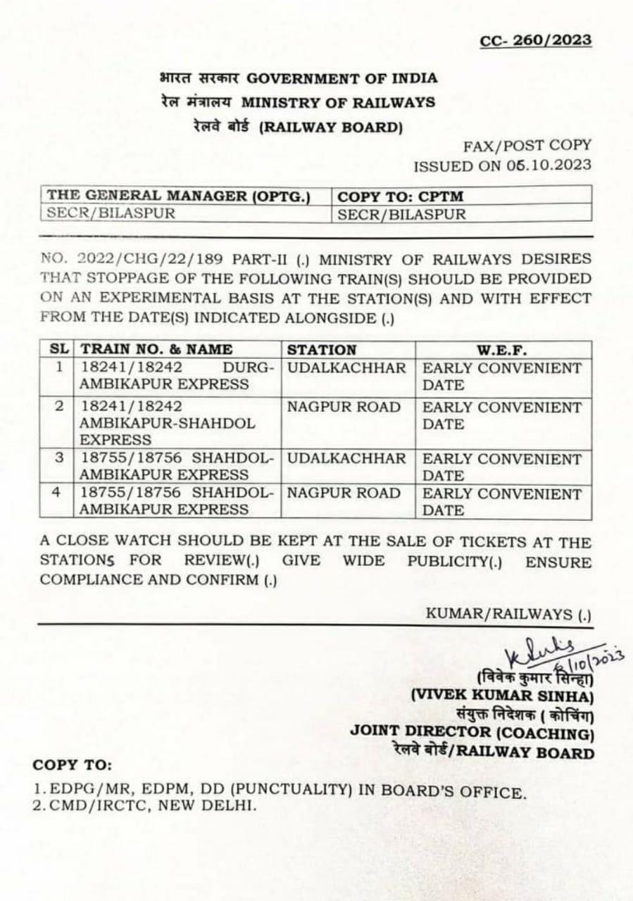 दुर्ग-अंबिकापुर एवं अंबिकापुर से दुर्ग के मध्य संचालित होने वाली ट्रेन का ठहराव नागपुर रोड पैसेंजर हाल्ट में कराने के कोरबा लोकसभा क्षेत्र की सांसद के प्रयासों को सफलता मिली है। इस संबंध में भारत सरकार के रेल मंत्रालय द्वारा दक्षिण पूर्व मध्य रेलवे बिलासपुर के महाप्रबंधक को निर्देशित करते हुए स्टेशनों में ठहराव का आदेश जारी कर दिया गया है। ट्रेन क्रमांक 18241/18242 दुर्ग-अंबिकापुर एक्सप्रेस, ट्रेन क्रमांक 18755/18756 शहडोल-अंबिकापुर एक्सप्रेस का ठहराव उदलकछार तथा नागपुर रोड स्टेशन में तय किया गया है। कोरबा लोकसभा क्षेत्र की सांसद श्रीमती ज्योत्सना चरणदास महंत के द्वारा इस संबंध में केन्द्रीय मंत्री अश्विनी वैष्णव से लगातार पत्र व्यवहार किया जाता रहा। सांसद ने रेल मंत्री का ध्यान आकृष्ट कराया ताकि छत्तीसगढ़ प्रदेश अंतर्गत भारतीय रेलवे यात्रियों की सुविधा विस्तार हेतु प्रदेश के निवासियों एवं स्थानीय जनप्रतिनिधियों के द्वारा लगातार उनके समक्ष अनुरोध किया जाता रहा कि दुर्ग-अंबिकापुर व अंबिकापुर-दुर्ग तक चलने वाली ट्रेन का ठहराव जो पूर्व में नागपुर रोड पैसेंजर हाल्ट में था, कोरोना काल में एक्सप्रेस गाड़ी के नाम से संचालन किया जा रहा था तब से ठहराव बंद है। यहां पर चिरमिरी नगर निगम क्षेत्र एवं 14 ग्राम पंचायतों के यात्रियों को गाड़ी नहीं रुकने से परेशानियों का सामना करना पड़ रहा है। प्रदेशवासियों के हितों और जनभावनाओं के दृष्टिगत नागपुर रोड पैसेंजर हाल्ट में ठहराव के लिए प्रयासरत सांसद की कोशिशों को सफलता मिली है। सांसद ने क्षेत्रवासियों की ओर से इस निर्देश के लिए भारत सरकार व रेल मंत्रालय तथा रेलवे बोर्ड के प्रति आभार जताया है।