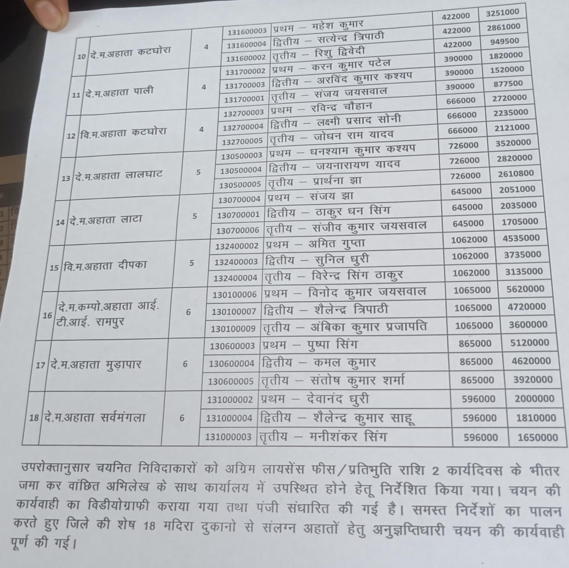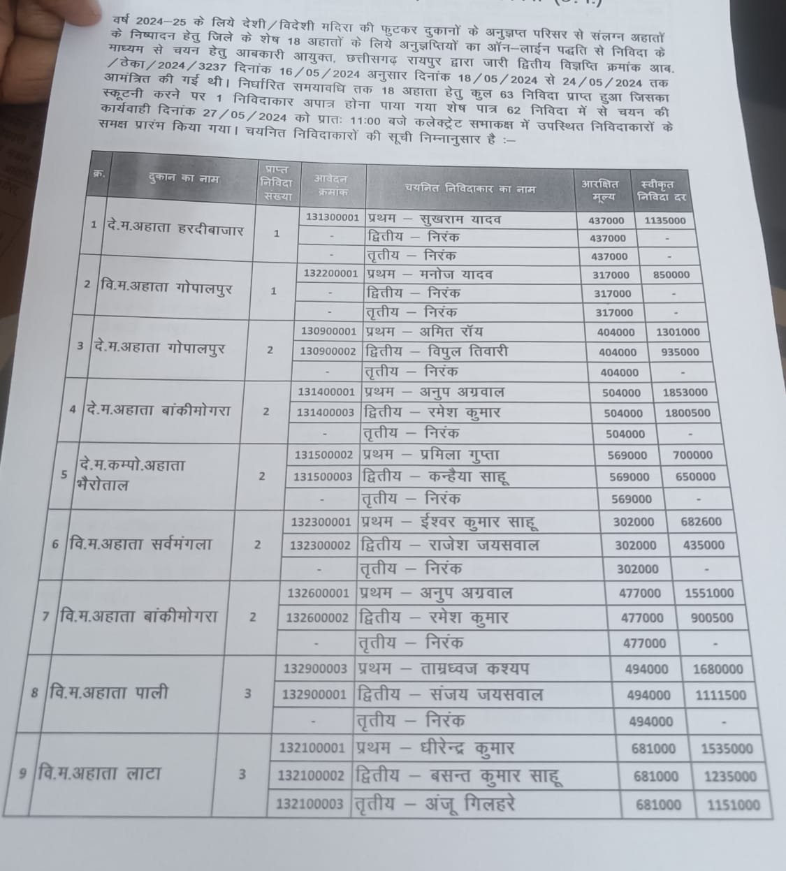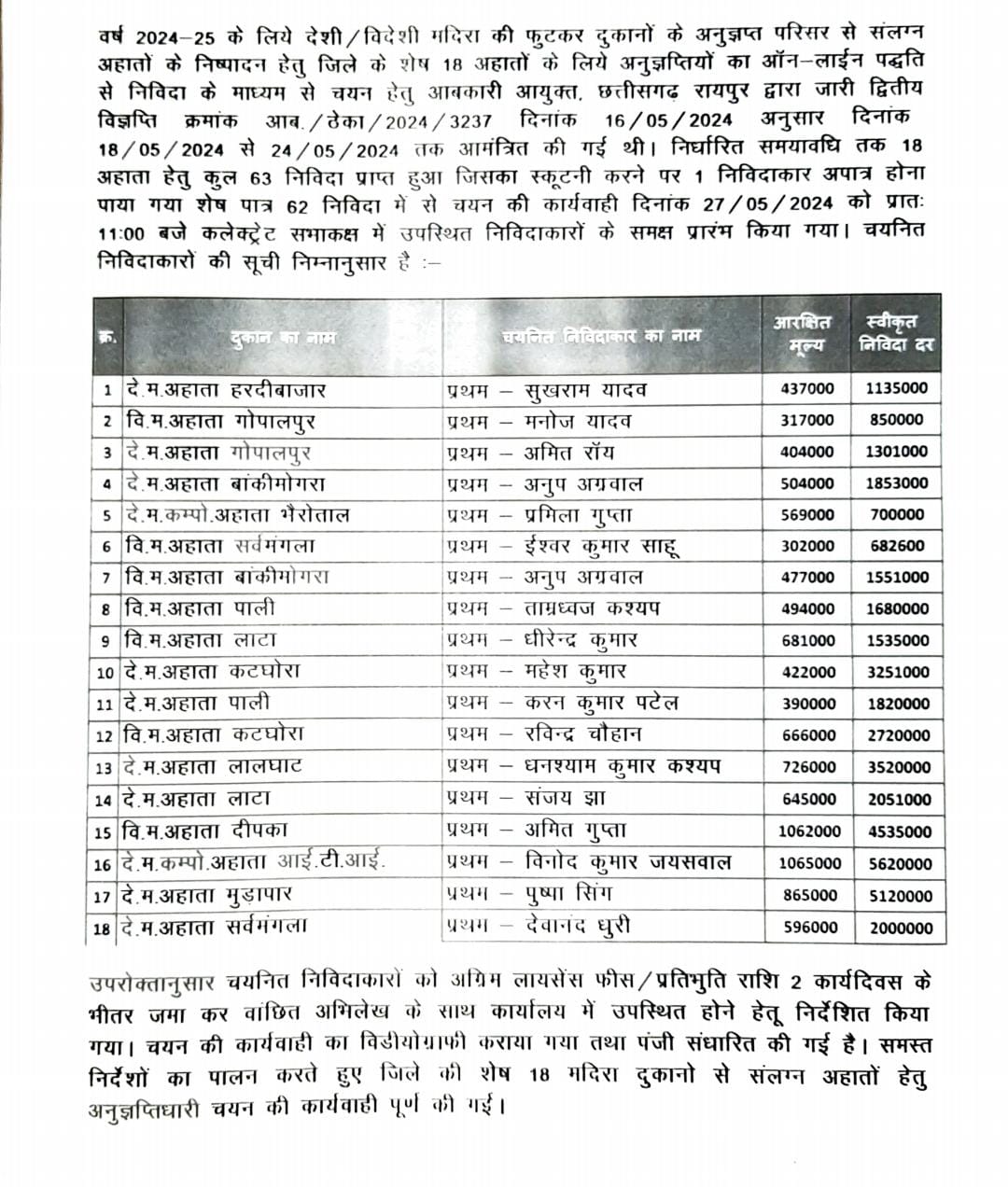 निर्धारित समयावधि तक 18 अहाता हेतु कुल 63 निविदा प्राप्त हुआ जिसका स्कूटनी करने पर 1 निविदाकार अपात्र होना पाया गया शेष पात्र 62 निविदा में से चयन की कार्यवाही दिनांक 27/05/2024 को प्रातः 11:00 बजे कलेक्ट्रेट सभाकक्ष में उपस्थित निविदाकारों के समक्ष प्रारंभ किया गया।