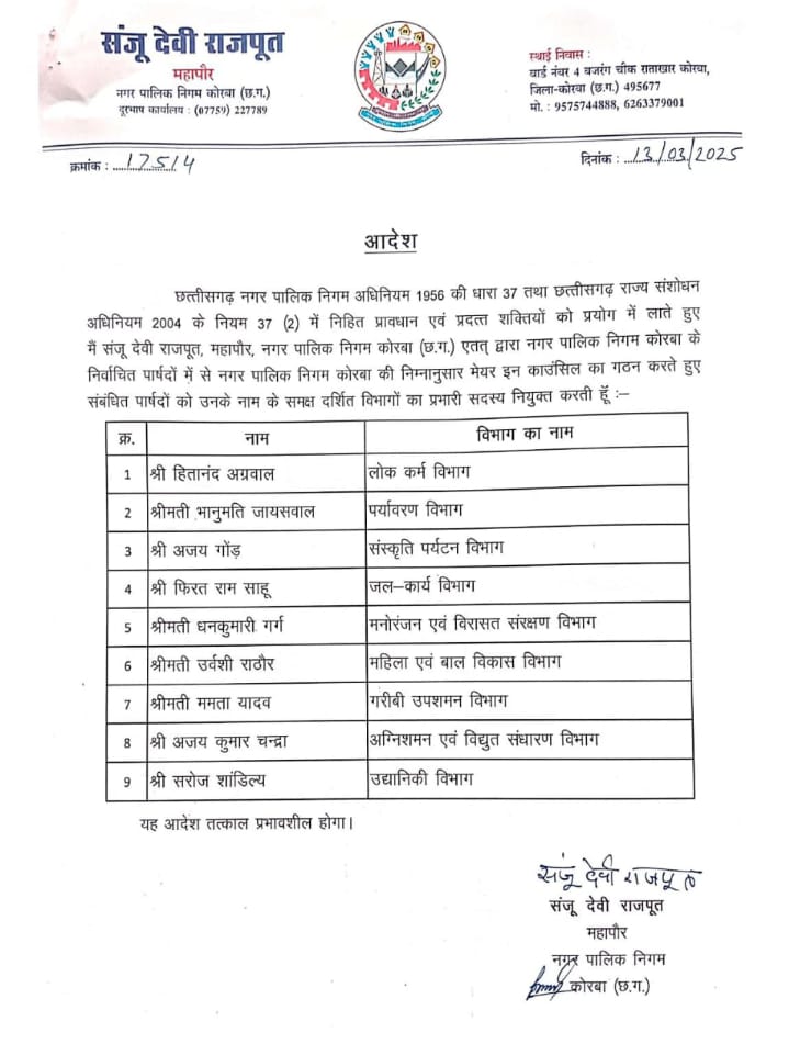 नगर निगम कोरबा के आदेशानुसार, निम्नलिखित व्यक्तियों को विभिन्न विभागों की जिम्मेदारी दी गई है—