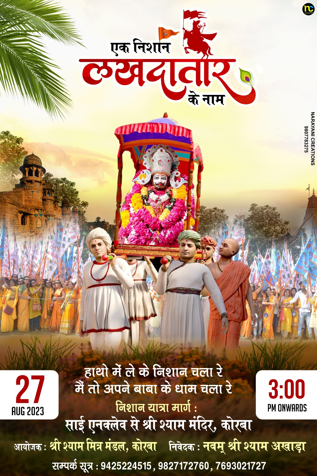 भजन संध्या के पूर्व दोपहर 3:00 बजे से साईं एंक्लेव कोरबा से श्याम मंदिर तक भक्तों के द्वारा हाथों में निशान लेकर भव्य निशान यात्रा निकाली जाएगी जिसमें आयोजन कर्ताओं द्वारा शहर सहित छत्तीसगढ़ राज्य के अन्य जिलों के भक्तों को आमंत्रित किया गया है, जिससे कि निशान यात्रा अद्वितीय हो,