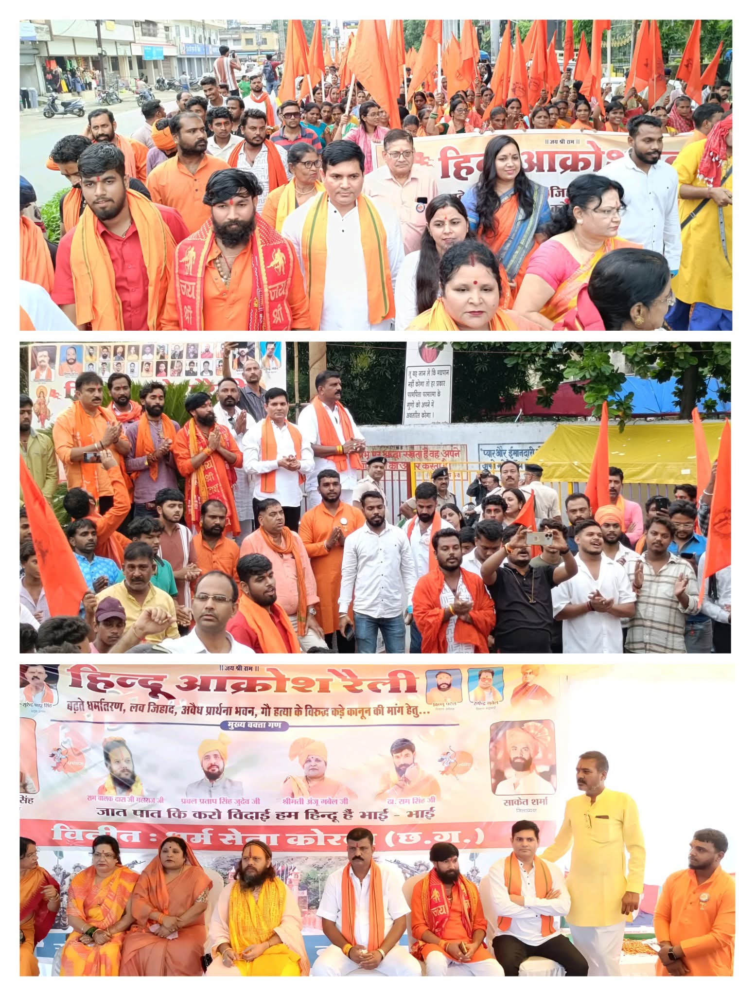 धर्मांतरण, लव जेहाद, गौहत्या के खिलाफ कड़े कानून की मांग को लेकर सर्व हिन्दू समाज की ओर से विशाल रैली निकालकर जिला प्रशासन को ज्ञापन सौंपा गया। सुभाष चौक कोरबा में आयोजित सभा को संत राम बालकदास जी ने संबोधित किया। इस अवसर पर धर्म सेना के प्रदेश अध्यक्ष सुरेंद्र प्रताप सिंह, ठा. राम सिंह, श्रीमती अर्चना सिंह, श्रीमती मंजू गबेल, श्री रणधीर पांडेय, श्री विष्णु पटेल, साकेत शर्मा सहित विभिन्न समाज के प्रमुख और सैकड़ों धर्म सेना के कार्यकर्ता उपस्थित रहे।Tags :