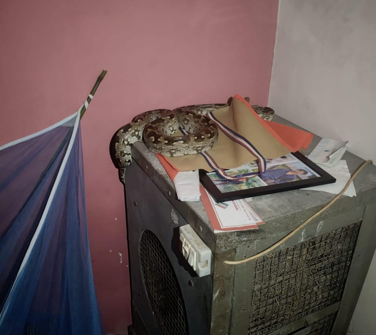 : कमरे के अंदर कूलर के ऊपर बैठा था भरी भरकम अजगर, लाइट नहीं होने के कारण मोबाइल के टॉर्च के सहारे जोखिम भरा खतरनाक रेस्क्यु।