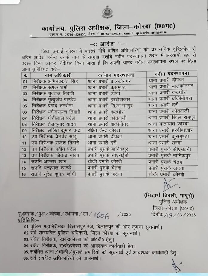 कोरबा( न्यूज उड़ान) पुलिस अधीक्षक सिद्धार्थ तिवारी ने 16 थाना- चौकी- पुलिस सहायता केंद्र के प्रभारी बदल दिए हैं।