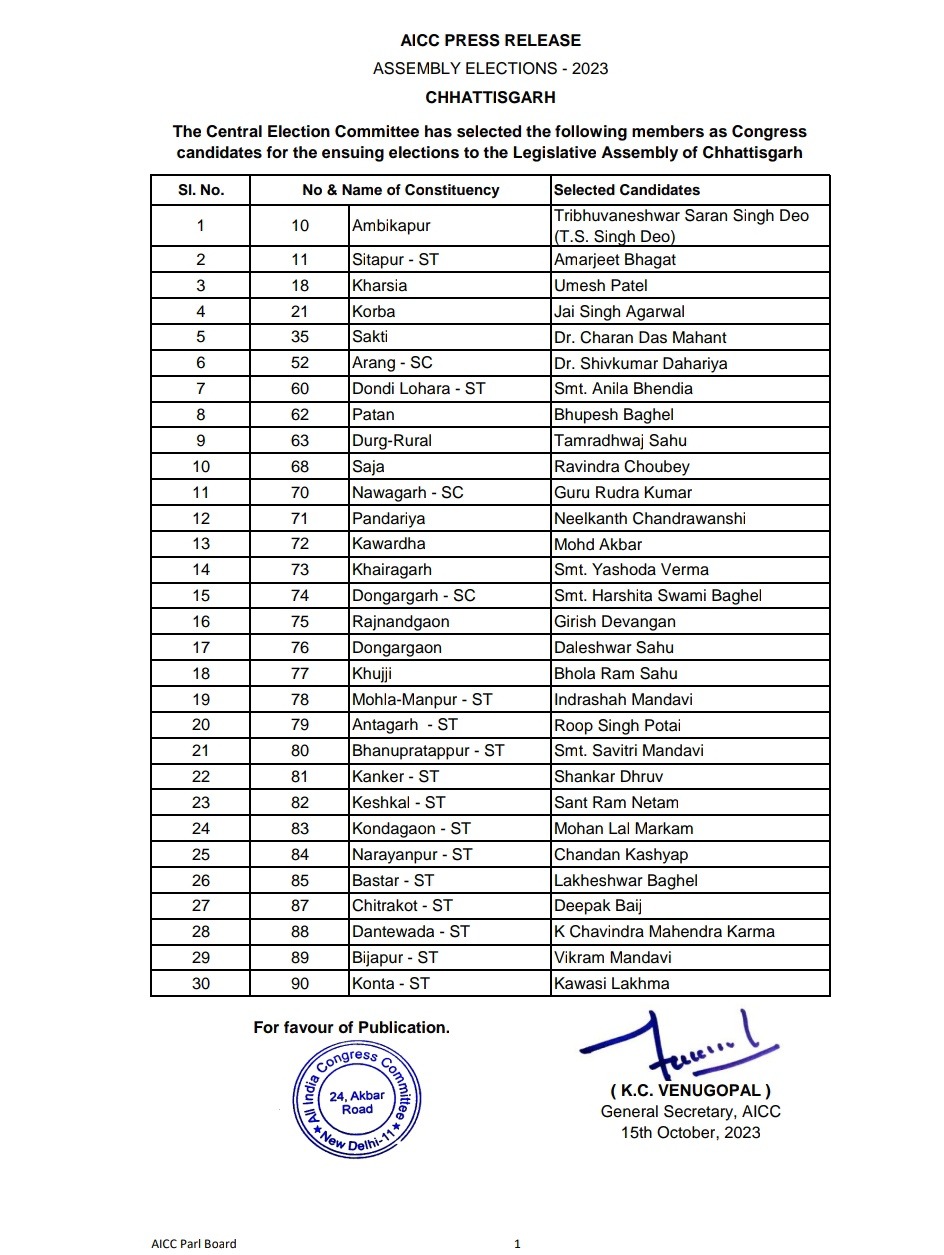 : छत्तीसगढ़: कांग्रेस की 30 उम्मीदवारों की लिस्ट जारी
