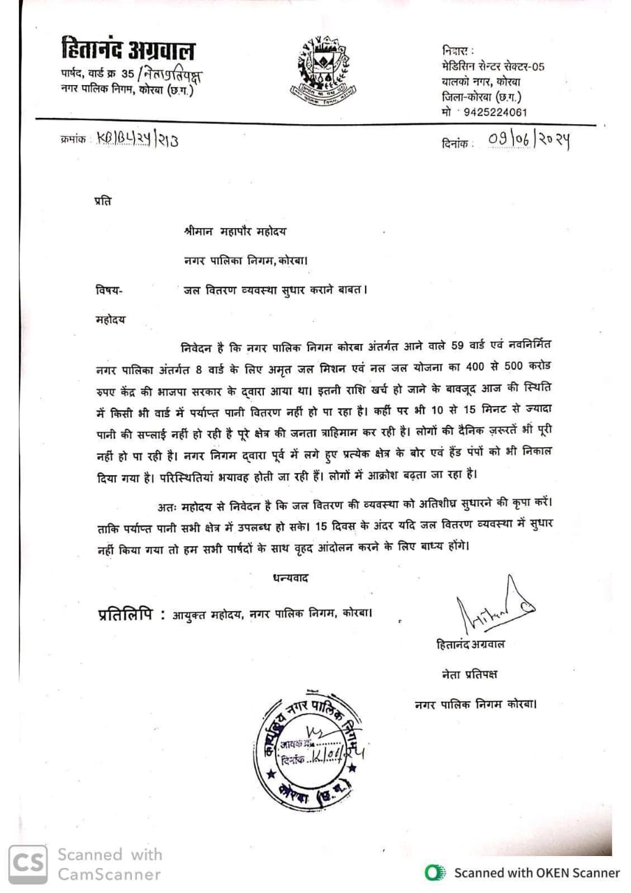 जिससे आए दिन बस्तियों में झगड़े का माहौल बना रहता है। इन समस्याओं से जनता को परेशान होता देख नगर निगम के नेता प्रतिपक्ष हितानंद अग्रवाल ने महापौर को पत्र लिखा एवं आंदोलन की चेतावनी दी, कि यदि 15 दिवस के अंदर महापौर ने जल वितरण व्यवस्था ठीक नहीं कराई, तो अन्य पार्षदों के साथ बृहद धरना प्रदर्शन होगा।Tags :