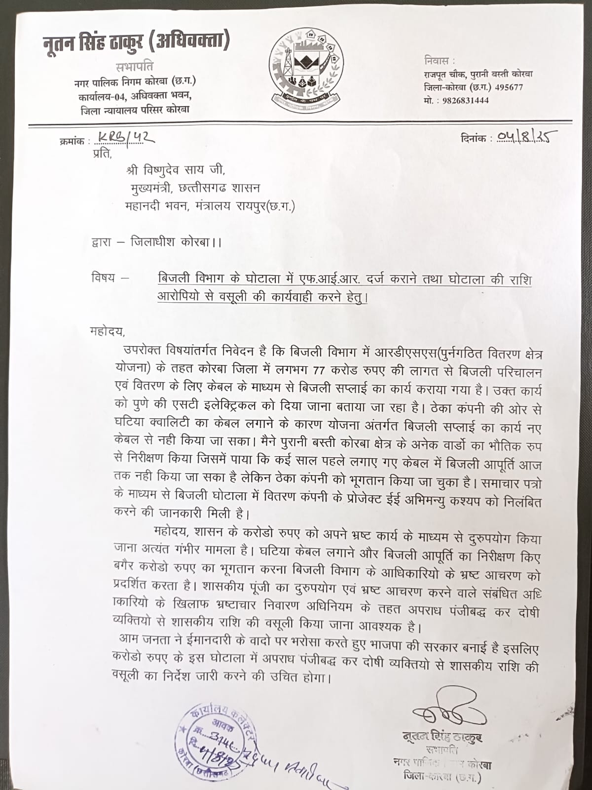 कोरबा( न्यूज उड़ान )नगर पालिक निगम कोरबा के सभापति नूतन सिंह ठाकुर ने बिजली विभाग में हुए करोड़ों के घोटाले को लेकर मुख्यमंत्री विष्णुदेव साय को पत्र लिखा है, जिसमें इस घोटाले की उच्चस्तरीय जाँच करने तथा एफ.आई.आर. दर्ज कर दोषियों से वसूली की कार्यवाही की माँग किया है।
