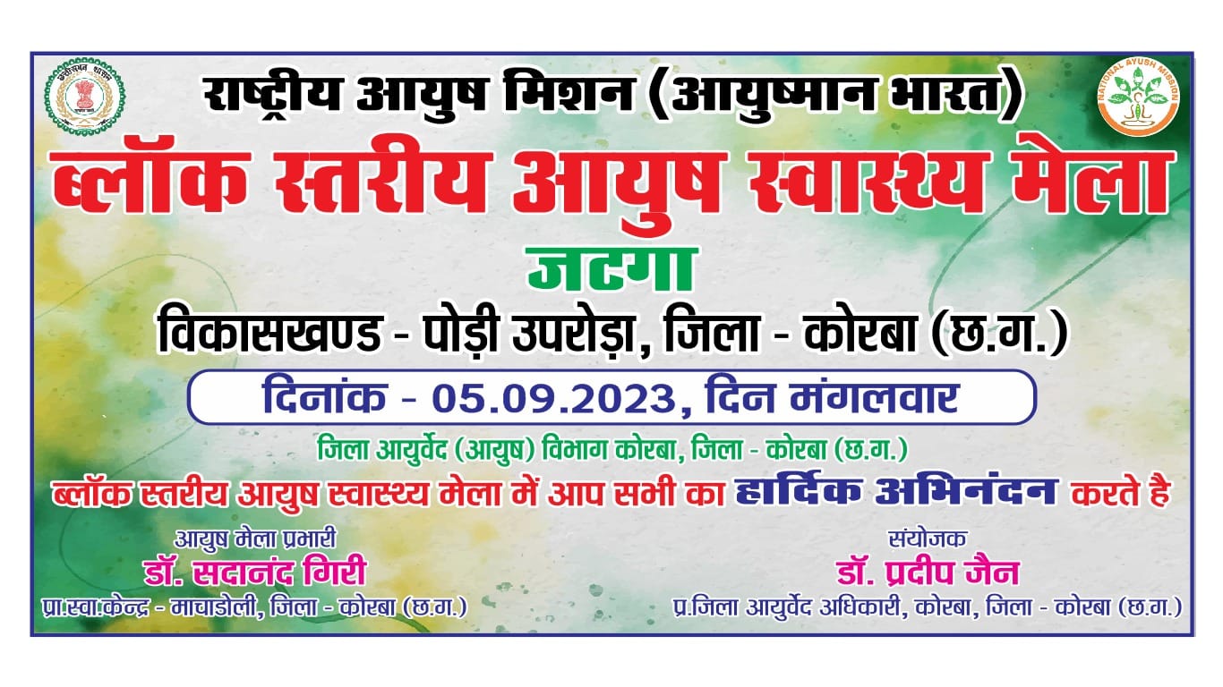 कोरबा जिले में आयुष विभाग द्वारा जगह जगह स्वास्थ्य शिविर का आयोजन सफलता पूर्वक किया जा रहा है, इसी कड़ी में आयुष विभाग छत्तीसगढ़ शासन के निर्देशानुसार और जिला प्रशासन कोरबा के मार्गदर्शन में प्रा.स्वा.केंद्र (आयुर्वेद) जटगा में आज दिनांक 05/09/2023 दिन मंगलवार को एक दिवसीय ब्लॉक स्तरीय निःशुल्क आयुष चिकित्सा शिविर एवं स्वास्थ्य मेला का आयोजन रखा गया है। इस स्वास्थ्य शिविर में विभिन्न प्रकार के बीमारियों का निःशुल्क इलाज किया जाएगा। शिविर प्रभारी श्री डॉ.सदानंद गिरी ने कहा कि आज जटगा में साप्ताहिक बाजार होने की वजह से शिविर में अच्छी खासी भीड़ होने की उम्मीद है। स्वास्थ्य मेला शिविर सुबह 9 बजे से शुरू होकर शाम 5 बजे तक चलेगा।