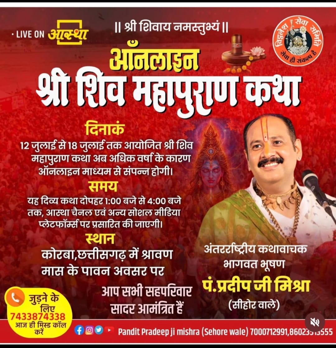 कोरबा ( न्यूज उड़ान) कोरबा में 12 से 18 जुलाई 2025 तक प्रस्तावित पंडित प्रदीप मिश्रा की शिव महापुराण कथा के सार्वजनिक आयोजन को निरंतर हो रही वर्षा के कारण रद्द कर दिया गया है।