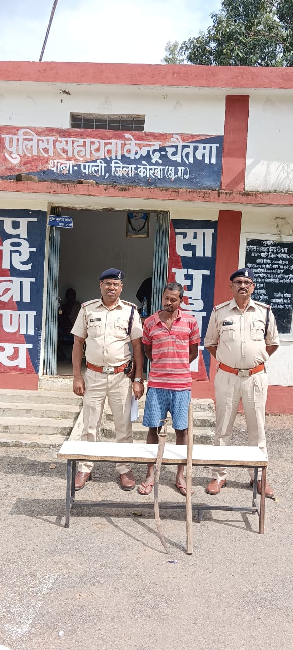 कोरबा। विवरण:- इस प्रकार है कि दिनाक 06/09/23 को प्रार्थी गुण पति जेकप द्वारा पुलिस चौकी चैतमा आकर रिपोर्ट दर्ज कराया कि आरोपी राजेन्द्र कुमार पुलस्त का माता पिता इसके पास आकर बताया कि राजेन्द्र पुलस्त घर मे रखे ईट को बेच रहा था जिसको मना करने पर आरोपी राजेन्द्र द्वारा अपने माता पिता को मारपीट करने की धमकी दे रहा है कहकर डर से इसके घर आकर रुके थे दिनाक 06/09/023 को सुबह 9 बजे करीब आरोपी प्रार्थी का घर आकर तुम् मेरे माता पिता को अपने पास रखने वाले कौन होते हो कहकर तलवार लेकर इसके घर अंदर घुस कर तलवार को लहराया तो तलवार को इसके घर वाले छीने तो पास रखे डण्डा से जान से मारने की धमकी देने की रिपोर्ट दर्ज कराने पर मामले की गंभीरता को देखते हुए तत्तकाल घटना कि सूचना श्रीमान पुलिस अधीक्षक महोदय श्री यू उदय किरण(भापुसे) एवम अतिरिक्त पुलिस अधीक्षक महोदय श्री अभिषेक वर्मा (रापुसे) को अवगत कराने पर श्रीमान अनुविभागीय अधिकारी कटघोरा पंकज ठाकुर(रापुसे) के पर्यवेक्षण में थाना प्रभारी श्री अभिनव कांत सिंह पुसके चैतमा प्रभारी सुरेश जोगी को कार्यवाही हेतु निर्देशित करने पर तत्तकाल सउनि लष्मी रात्रे आरक्षक 344 सिमेंद्र सिंह 398 चमार सिंह मरावी 30 प्रवचन कवर के द्वारा आरोपी को घेरा बंदी कर पकड़ा गया एवम घटना में प्रयुक्त एक नग लोहे की तलवार,लकड़ी का डंडा को जप्त कर आरोपी की गिरफ्तार कर रिमांड पर भेज गया है।