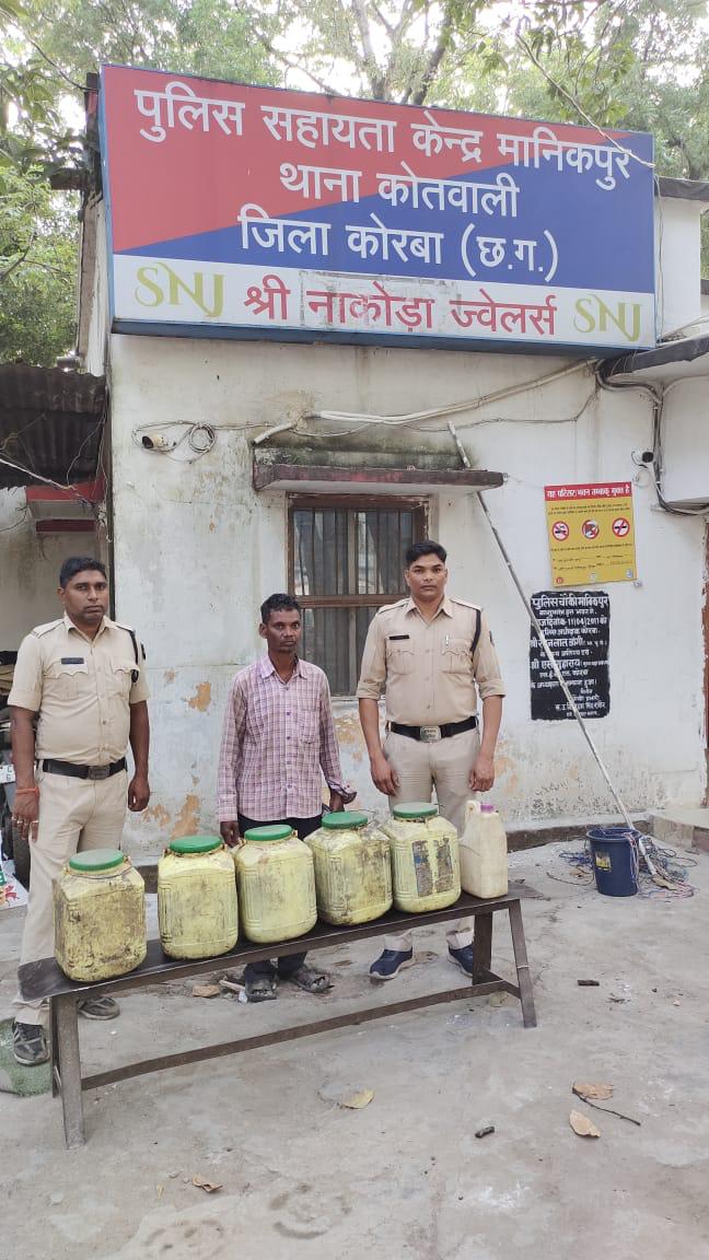 श्रीमान पुलिस अधीक्षक महोदय कोरबा श्री जितेन्द्र शुक्ला के दिशा निर्देश पर अतिरिक्त पुलिस अधीक्षक महोदय श्री अभिषेक वर्मा, नगर पुलिस अधीक्षक महोदय श्री भूषण एक्का एवं थाना प्रभारी कोतवाली श्री रूपक शर्मा के मार्गदर्शन एवं चौकी प्रभारी मानिकपुर प्रेमचंद साहू के नेतृत्व में आज दिनांक 16/10/2023 को 103 लीटर अवैध कच्चा महुआ शराब जप्त करने में सफलता प्राप्त हुई है. मुखबिर सुचना के आधार पर आज दिनांक 16/10/2023 के पूर्वान्ह ढेलवाडीह निवासी बुधवार उरांव पिता ननकी दाऊ उरांव उम्र 50 वर्ष से 103 लीटर कच्चा महुआ शराब जप्त कर आरोपी के विरूध्द 34(2) आबकारी अधिनियम के तहत अपराध पंजीबद्ध कर आरोपी को न्यायिक रिमांड में भेजा गया है. उक्त कार्यवाही मेँ मप्रआर 117 स्मिता बेक, आर 442 अशोक पाटले, आर 263 संजय रात्रे, आर 747 प्रदीप, आर 134 संदीप सिंह का विशेष योगदान रहा.