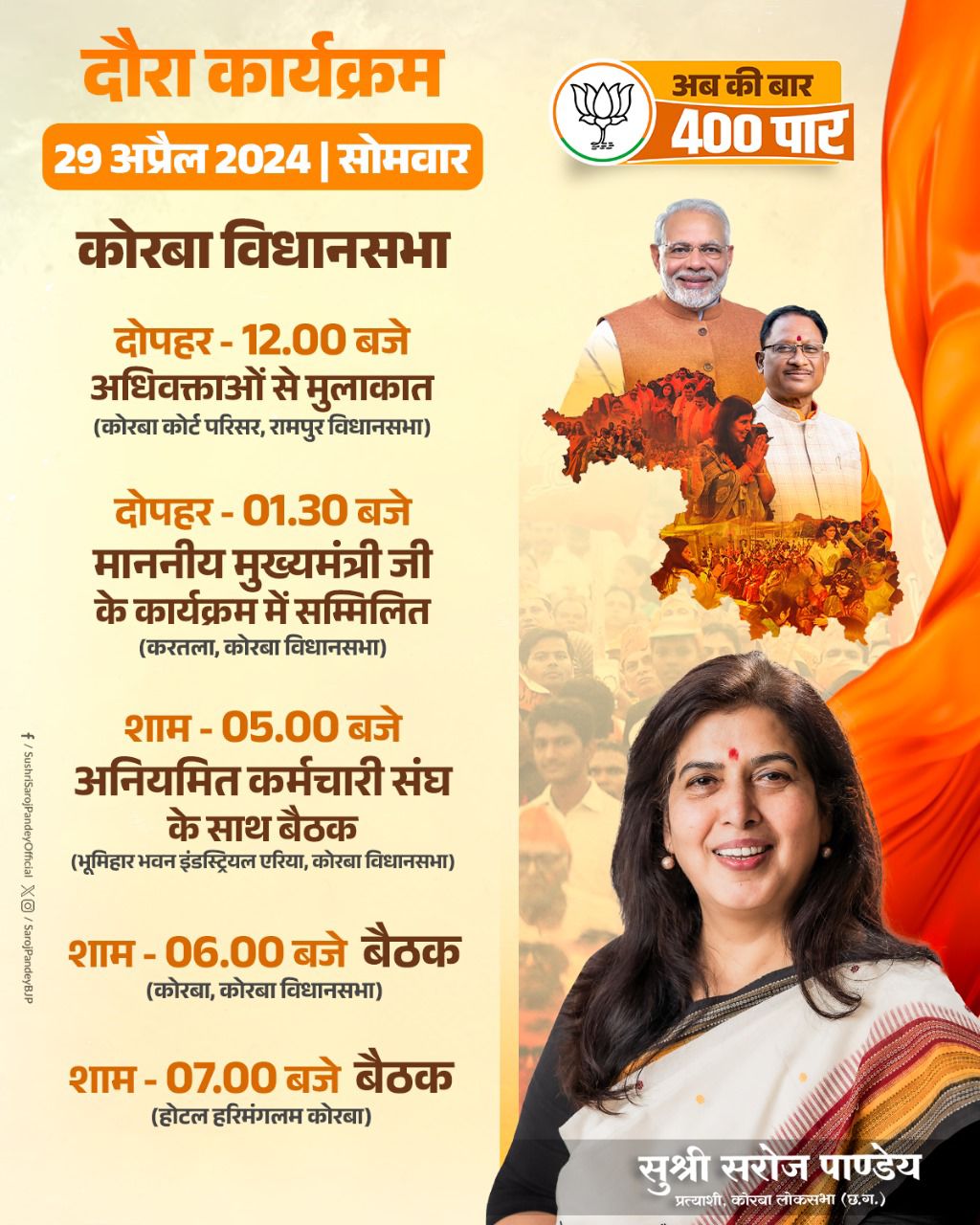 सरोज पांडेय ने कांग्रेस पर बरसते हुए कहा कि पिछले 5 साल में एक लुटेरी और भ्रस्टाचारी कांग्रेस सरकार बनी थी जो प्रधानमंत्री मोदी द्वारा दिये गए 18 लाख से अधिक गरीबो के आवास को बनने से रोका, वही कांग्रेस की भूपेश सरकार ने बीमार लोगो को आयुष्मान योजना वंचित रखा, साथ ही केंद्र सरकार की वह सभी जनहितकारी योजनाओं को छत्तीसगढ़ की जनता से दूर रखा। गरीबो आदिवासियों के मुह से निवाला छीनने वली कांग्रेस सरकार जनता के पैसों में भ्रष्टाचार करके बंदरबाट किया और पूरे 5 साल जमकर घोटाले किये। जिसका कांग्रेस को महापाप लगा, इस महापाप को जनता ने विधानसभा चुनाव में एक परिणाम दिया और अब लोकसभा में भी परिणाम देने को तैयार है।