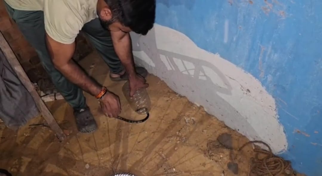परिवार ने सांप को ढककर रखने की कोशिश की थी, लेकिन वह वहां से निकलकर दूसरे कमरे में पहुँच गया था।