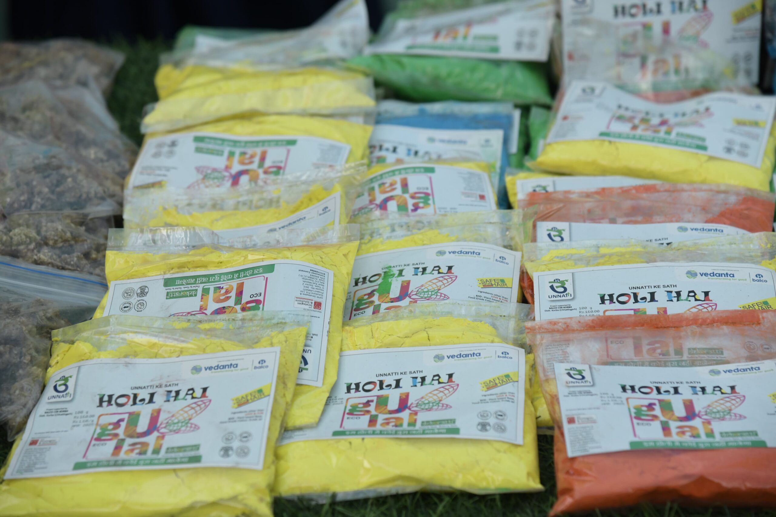 बालको के उन्नति परियोजना के अंतर्गत एसएचजी सदस्यों द्वारा उन्नति इको और उन्नति हैप्पी दो प्रकार के गुलाल बनाये जा रहे हैं।