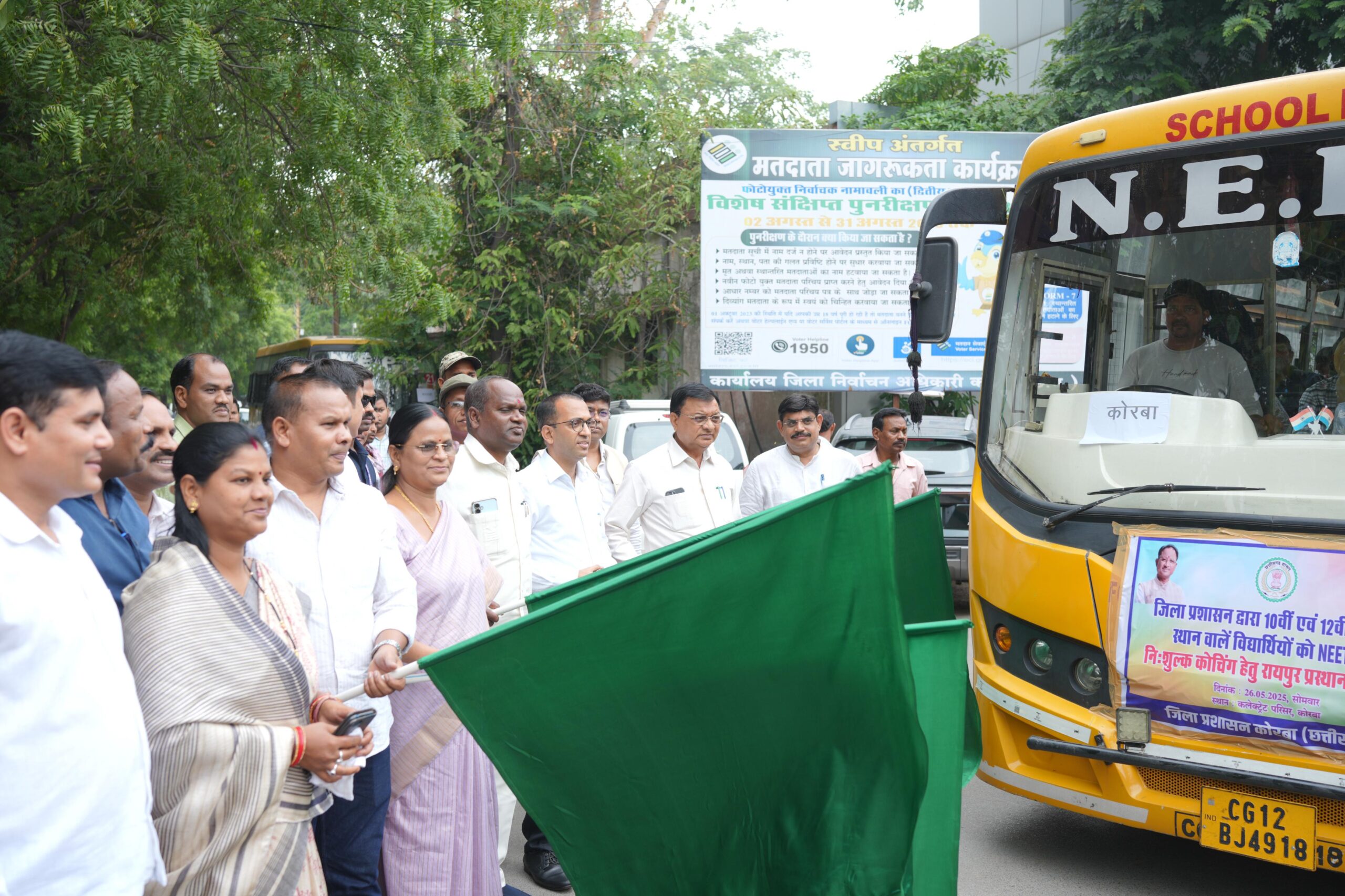 कोरबा( न्यूज उड़ान )छत्तीसगढ़ शासन के वाणिज्य, उद्योग एवं श्रम मंत्री श्री लखनलाल देवांगन एवं अन्य अतिथियों की उपस्थिति में आज कलेक्ट्रेट के सभाकक्ष में जिले के मेधावी विद्यार्थियों हेतु जेईई, नीट की निःशुल्क प्रशिक्षण हेतु बस से रवाना किया गया।