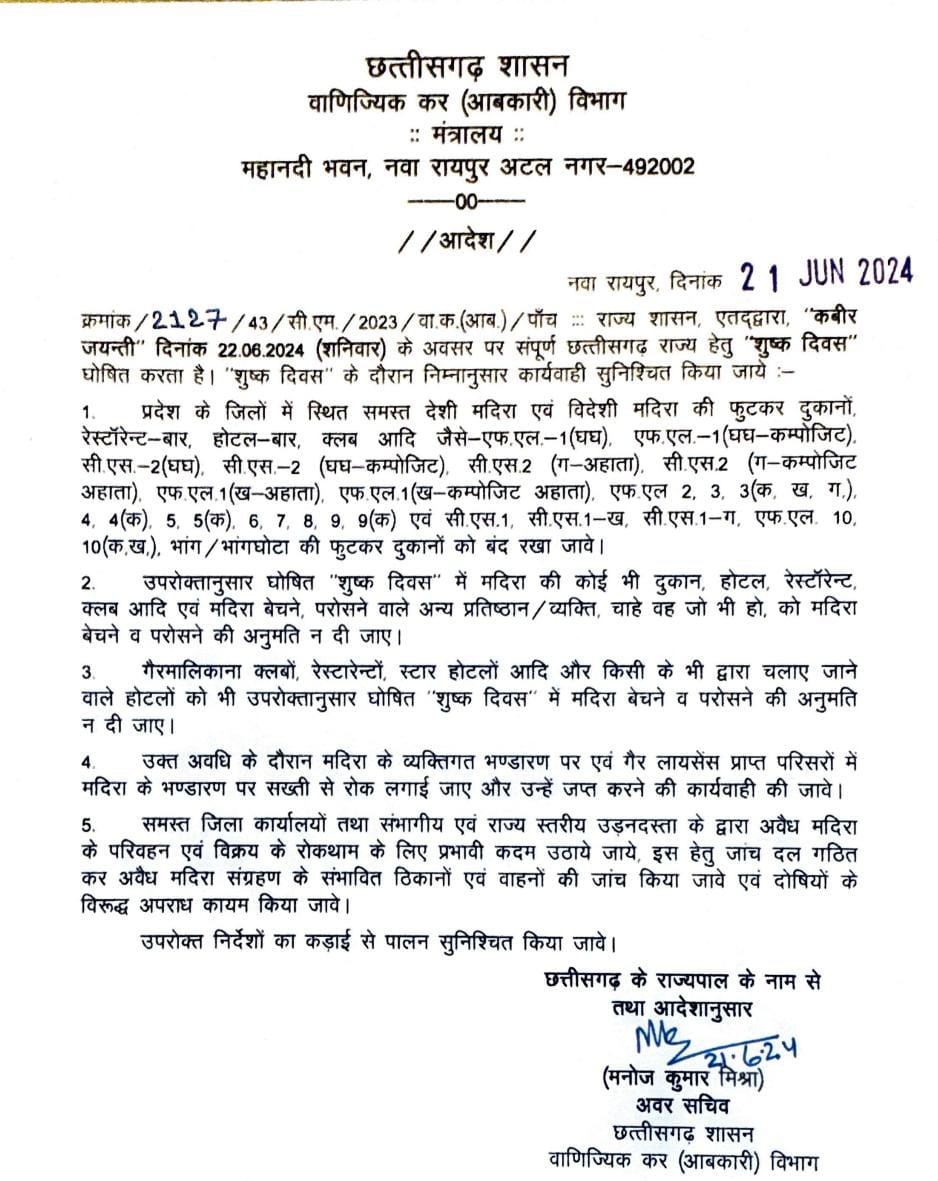 छतीशगढ़ कोरबा( न्यूज उड़ान) राज्य शासन, एतद्वारा, "कबीर जयन्ती" दिनांक 22.06.2024 (शनिवार) के अवसर पर संपूर्ण छत्तीसगढ़ राज्य हेतु "शुष्क दिवस" घोषित करता है।