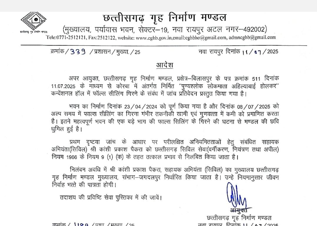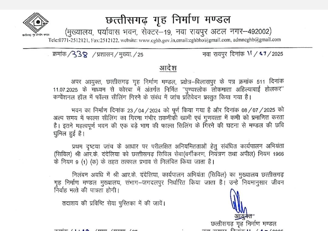इस मामले में अब छत्तीसगढ़ गृह निर्माण मण्डल ने कार्रवाई करते हुए दो इंजीनियरों को निलंबित कर दिया है।