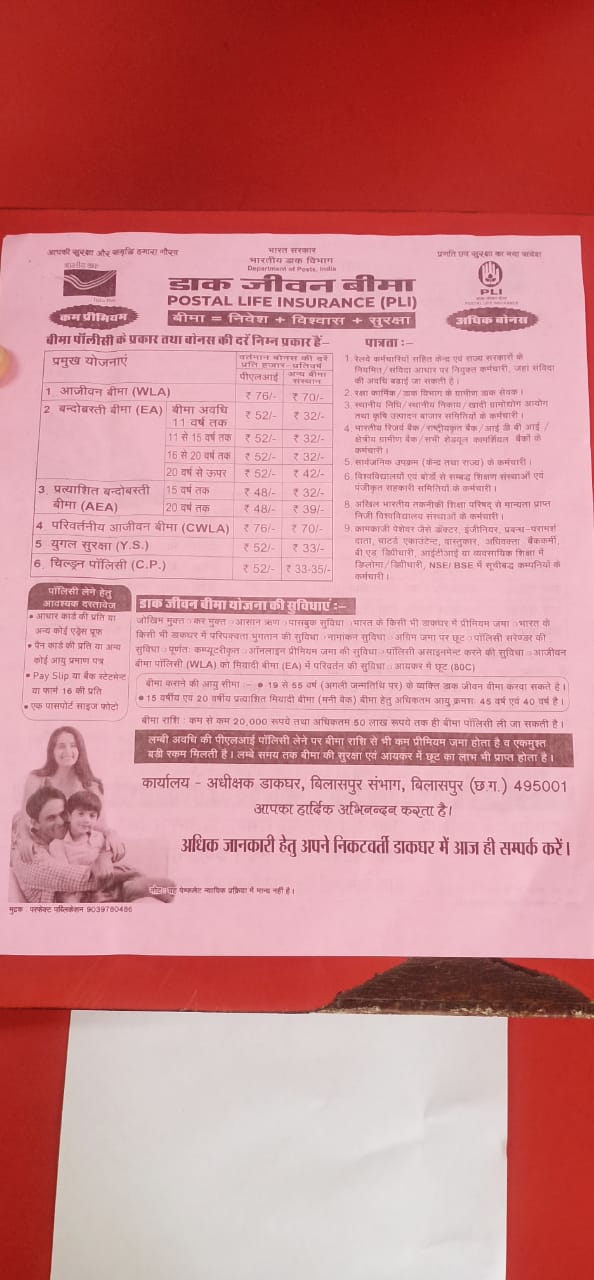 कोरबा डाक विभाग की विभिन्न योजनाओं के संबंध में आम जनता को जानकारी प्रदान करने के उद्देश्य से प्रधान डाकघर कोरबा द्वारा दिनांक 23.09.2023 शनिवार को सुभाष चौक निहारिका कोरबा में विशाल कैम्प का आयोजन किया गया है। जिसके अंतर्गत महिला सम्मान बचत पत्र / सुकन्या समृध्दि योजना / पीपीएफ / आरडी / एफडी के संबंध में जानकारी देकर तुरंत खाता खोला जायेगा। डाक जीवन बीमा / ग्रामीण डाक जीवन बीमा के संबंध में जानकारी दी जायेगी। साथ ही IPPB खाते खोलकर AEPS / GAG/GTL का कार्य भी किया जायेगा। आधार अपडेशन एवं नये आधार कार्ड भी बनाये जायेंगे। खाता खोलने बावत 2 फोटो, आधार / पेन कार्ड की फोटोकॉपी लेकर आ सकते है। बच्चों का खाता खोलने के लिए जन्म प्रमाण पत्र की छायाप्रति साथ में लायें। महिला सम्मान बचत पत्र 2 वर्ष के लिए 7.5% ब्याज दर पर फिक्स डिपाजिट कर सकते है। सुकन्या समृध्दि खाता 8% ब्याज दर पर रु.250 / - से खाता खोला जाएगा। प्रधान डाक घर आम जनता से अपील करती है कि इस कैम्प मे भाग लेकर डाक विभाग की विभिन्न योजनाओं का लाभ उठावें ।